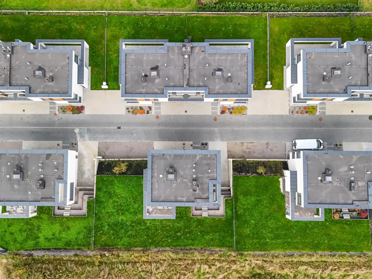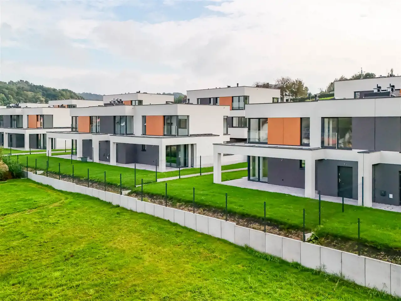 Nowoczesna architektura łączy prostą, elegancką formę z funkcjonalnością. Duże przeszklenia zapewniają świetne doświetlenie wnętrz, a ogrody i tarasy pozwalają cieszyć się prywatną strefą relaksu.