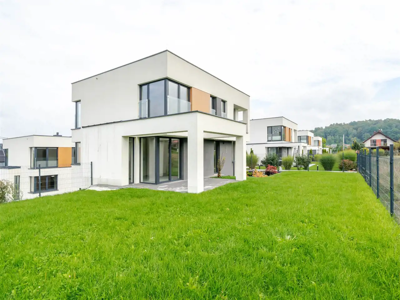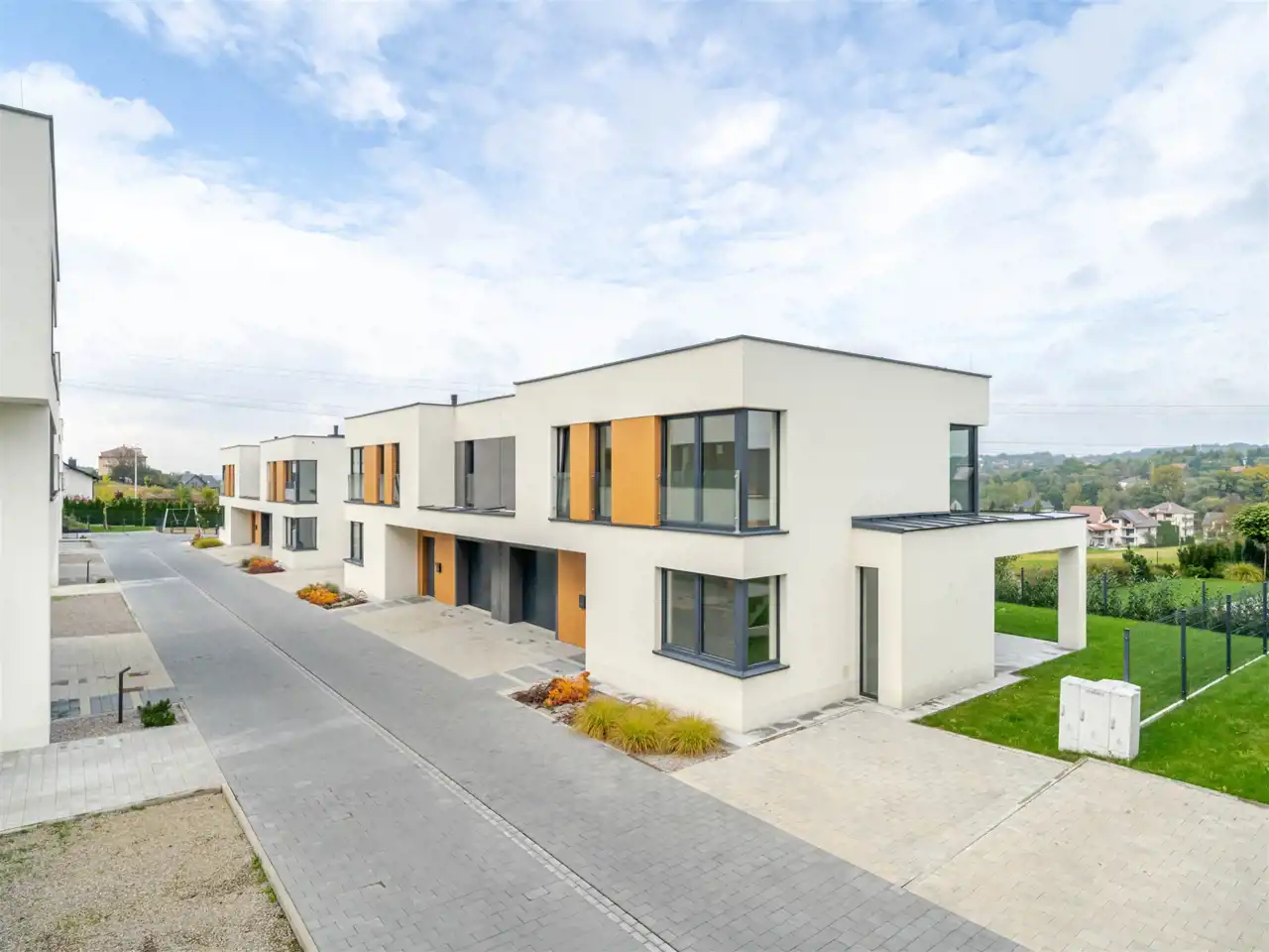 Nowoczesna architektura łączy prostą, elegancką formę z funkcjonalnością. Duże przeszklenia zapewniają świetne doświetlenie wnętrz, a ogrody i tarasy pozwalają cieszyć się prywatną strefą relaksu.