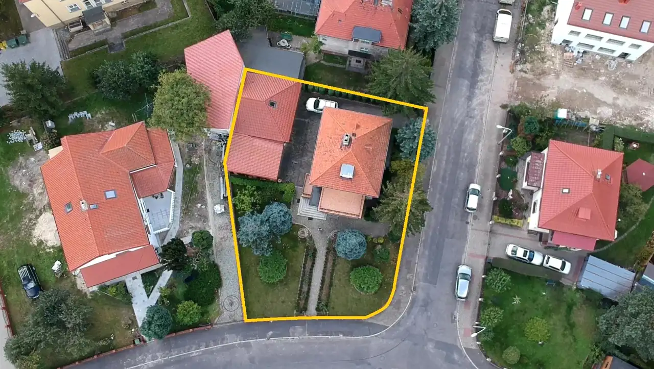 Poniemiecka willa posadowiona na narożnej działce o powierzchni 707 m2 i przybliżonych wymiarach 25 m x 28 m