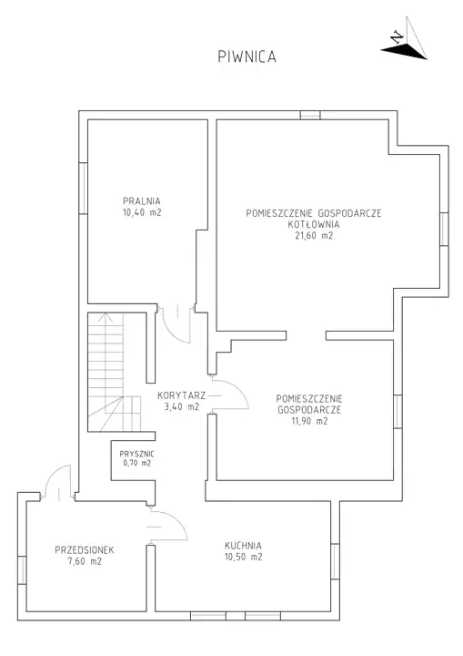 - PIWNICA (HŚR.= 185 cm): 2 pomieszczenia gospodarcze (21,5 m2; 12 m2), kuchnia (10,5 m2), pralnia (10,5 m2), prysznic (1 m2) i komunikacja;