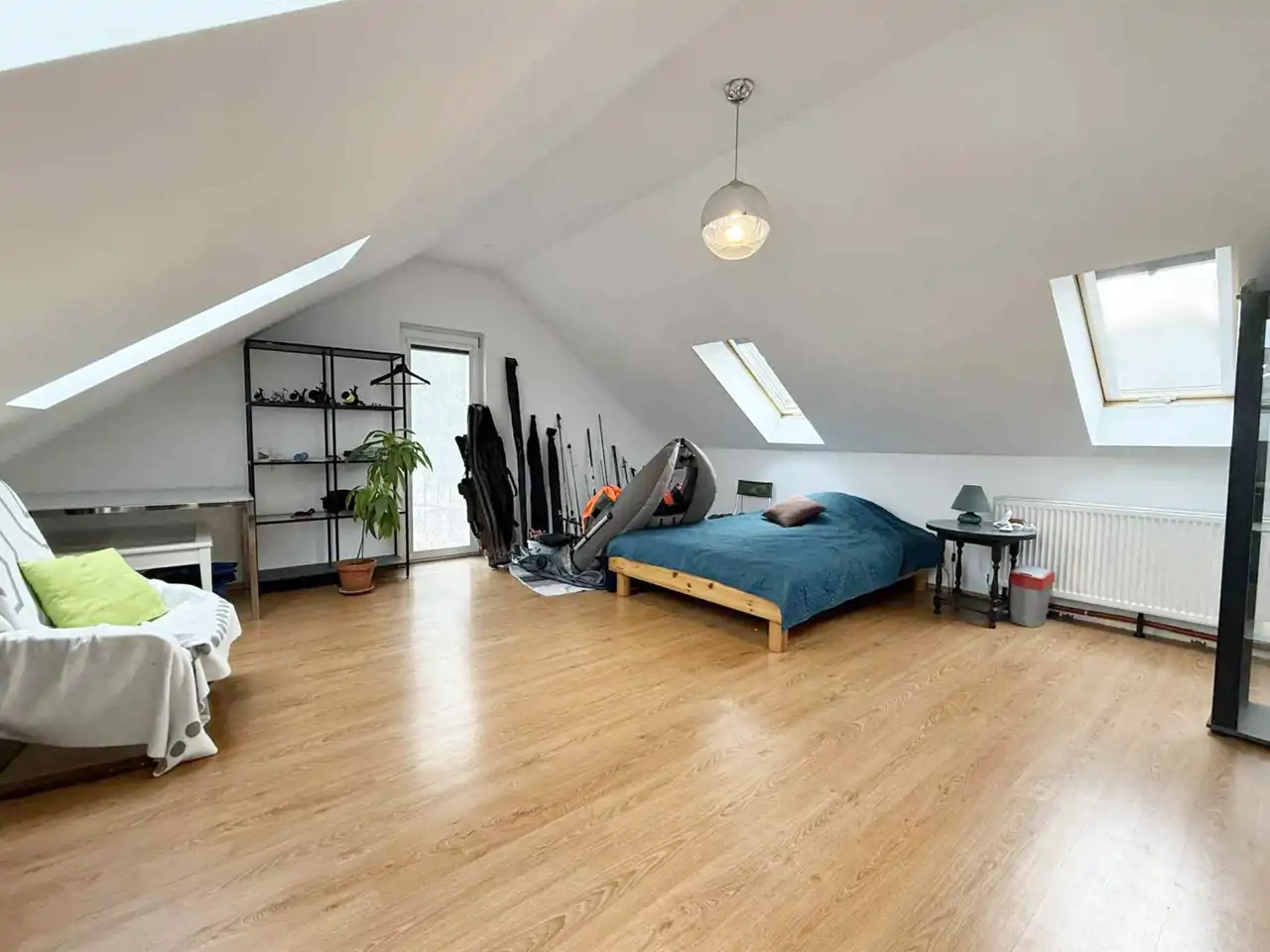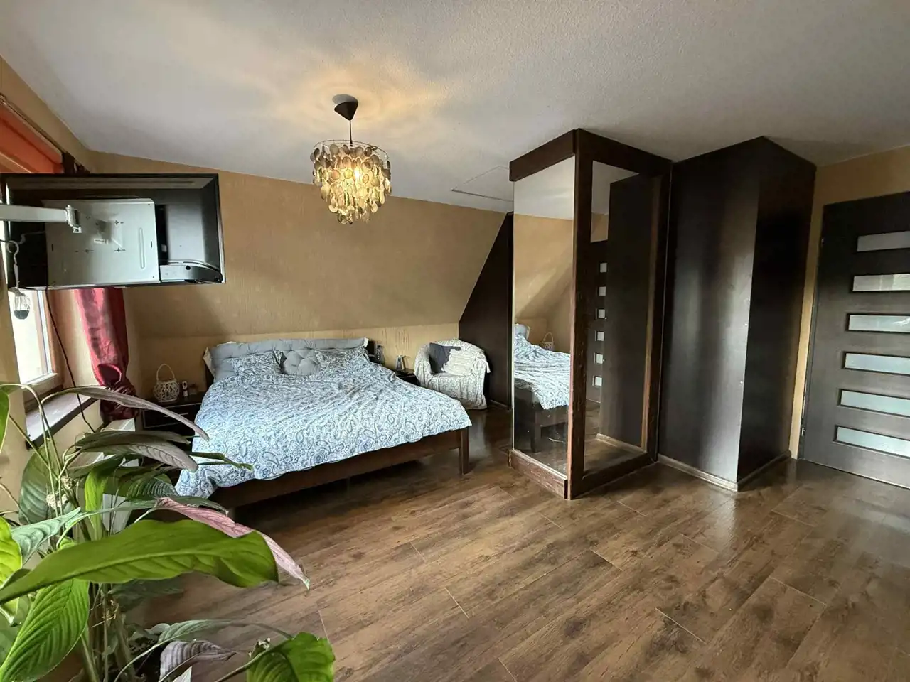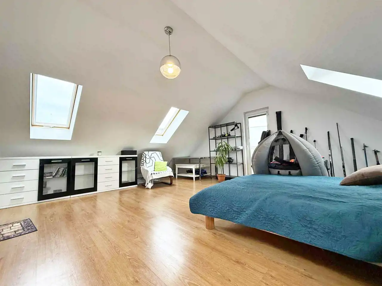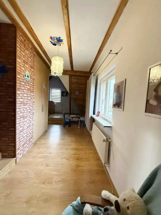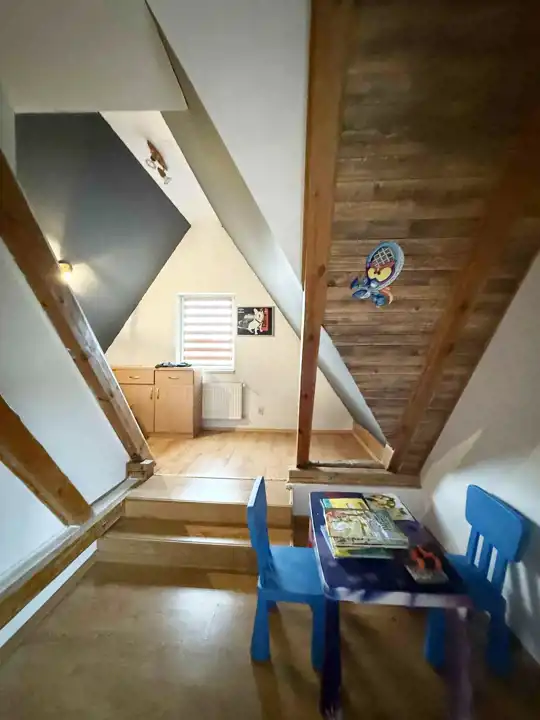 I piętro: Na górę prowadzą oryginalne schody, z piękną drewnianą barierą. Znajdziemy tu dwie duże sypialnie, z zagospodarowanymi skosami, w których zainstalowano meble na wymiar, a także pojemną garderobą, oraz przestronny, otwarty pokój z oknami typu velux i zainstalowanymi w nich zaciemniającymi roletami i wnęką balkonową.