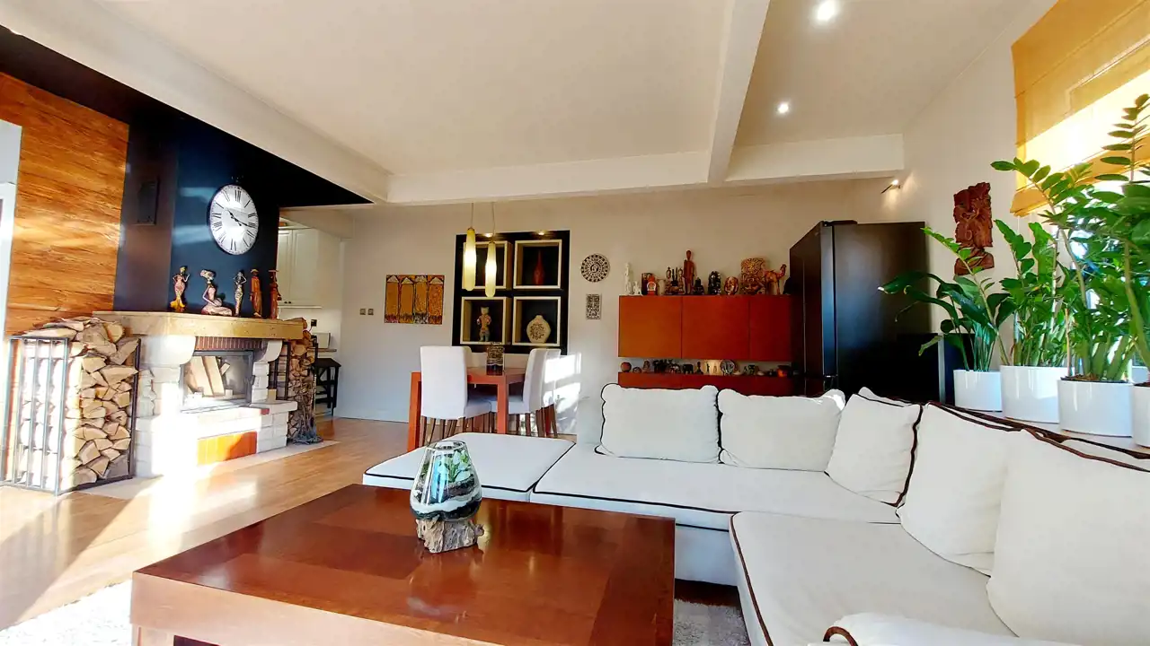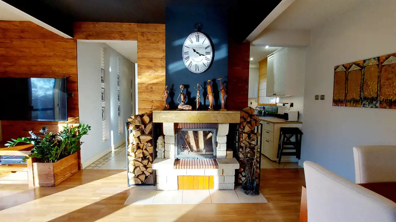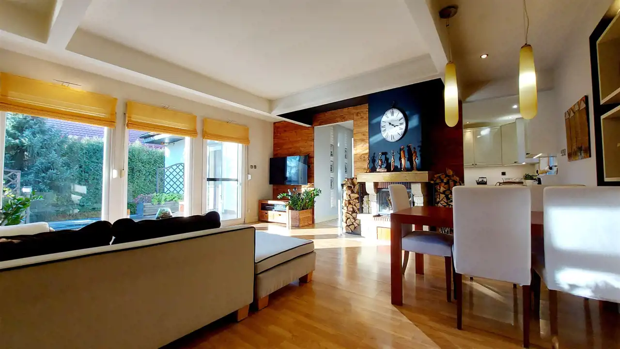 - Jasny i przestronny salon z kominkiem oraz wyjściem na taras