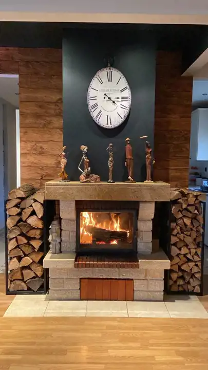 - Nowoczesny piec gazowy dwufunkcyjny oraz stylowy kominek w salonie