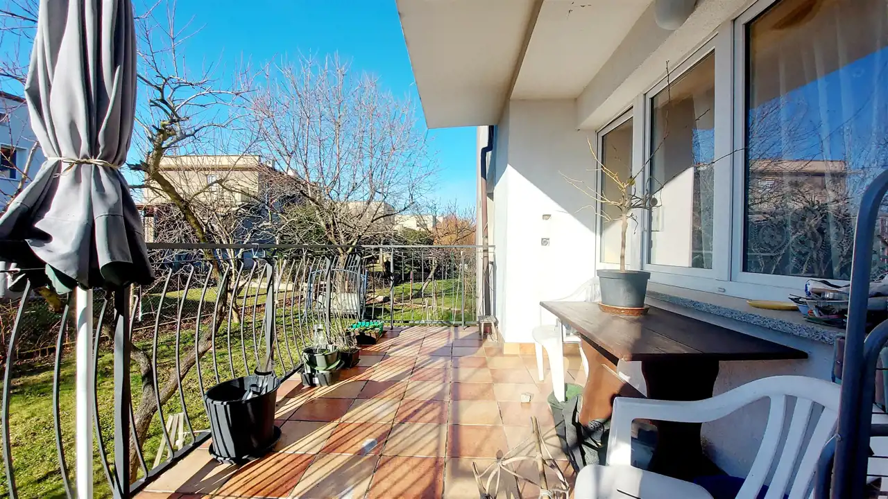 - Taras z widokiem na ogród oraz balkon na piętrze.