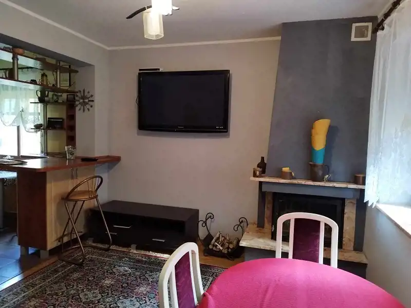 W salonie znajduje się kominek co nadaje pomieszczeniu klimatu oraz ciepła, które ogrzewa zimą całość nieruchomości.