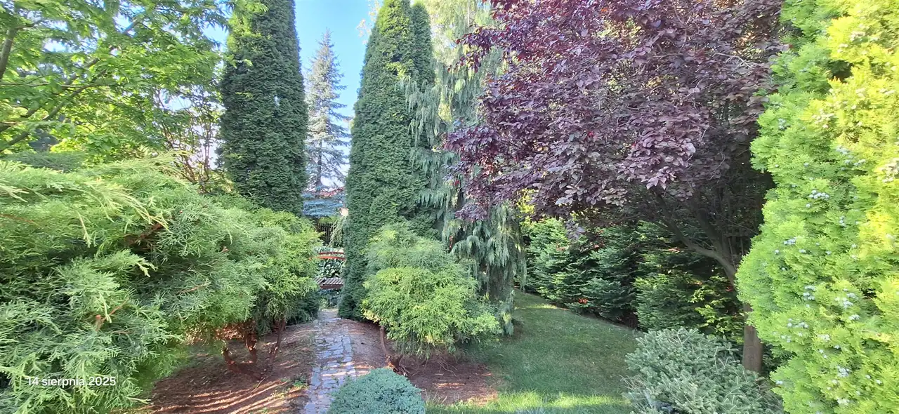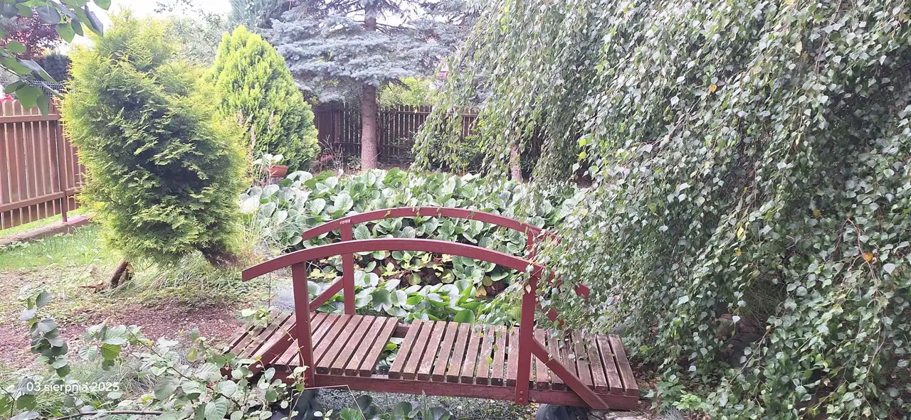 WYJĄTKOWO UROKLIWIE SKOMPONOWANY OGRÓD, Z OCZKIEM WODNYM, MOSTKIEM, PRZEPIEKNE, HARMONIJNE NASADZENIA, STUDNIA DO PODLEWANIA OGRODU. NIEZWYKLE MIEJSCE REKREACJI, Z DALA OD ZGIEŁKU DAJE POCZUCIE INTYMNOŚCI