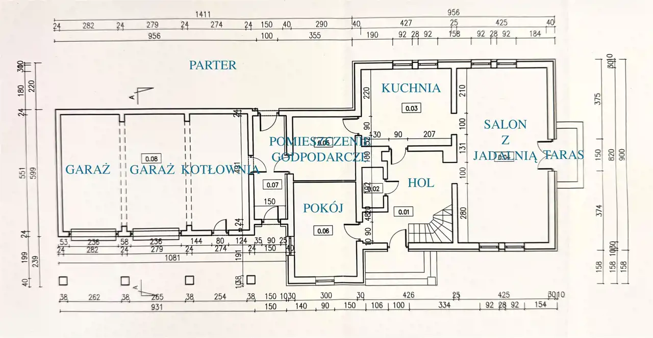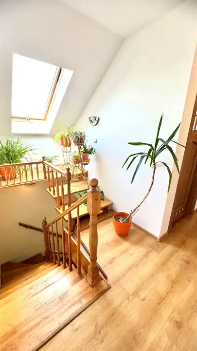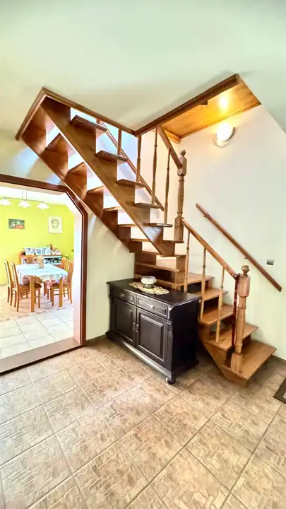 Na parterze ulokowany salon, jadalnia, kuchnia, pomieszczenie gospodarcze, łazienka, pokój oraz hol. Na górze trzy pokoje ( w tym jeden z dużą garderobą ), łazienka i hol.