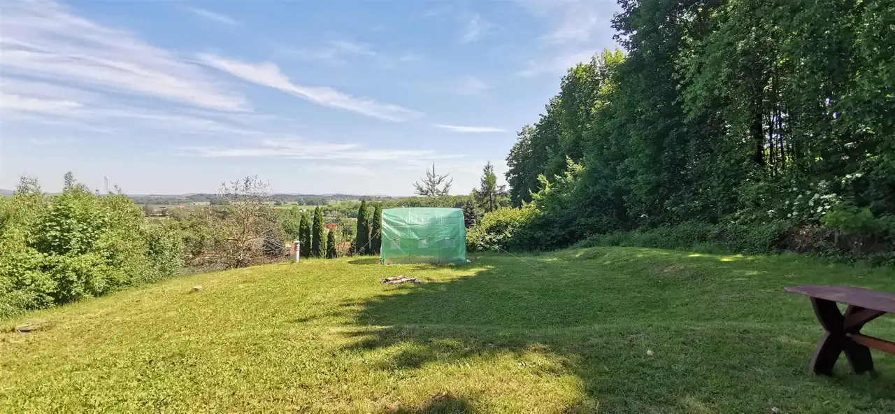 - Działka Zagospodarowana, lekko nachylona, prostokąt