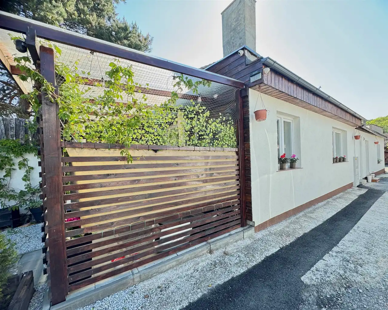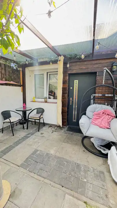 Przed wejściem do budynku zrobione patio zadaszone poliwęglanem. Obok miejsce postojowe. Teren ogrodzony.