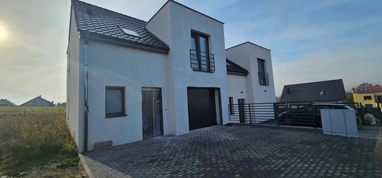 4. Elewacja jest z tynkiem (baranek w kolorze białym)oraz parapety aluminiowe antracytowe.