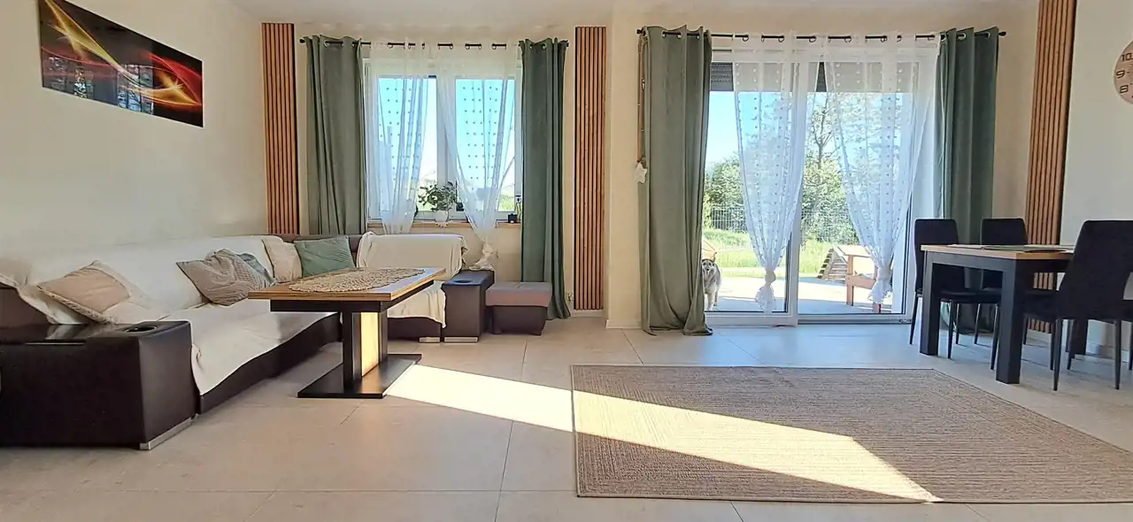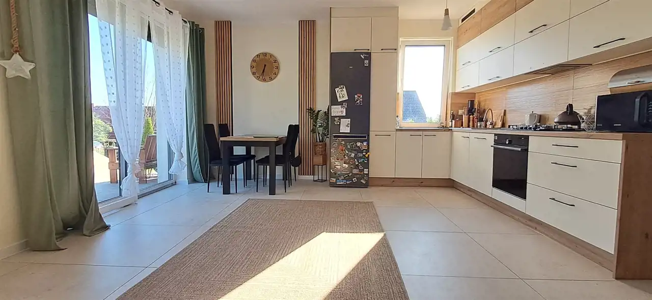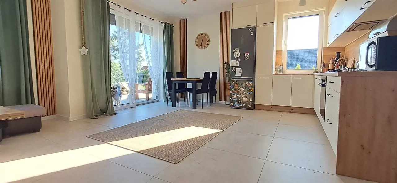 Przestronny i słoneczny salon z otwartą kuchnią oraz bezpośrednim wyjściem na taras i ogród