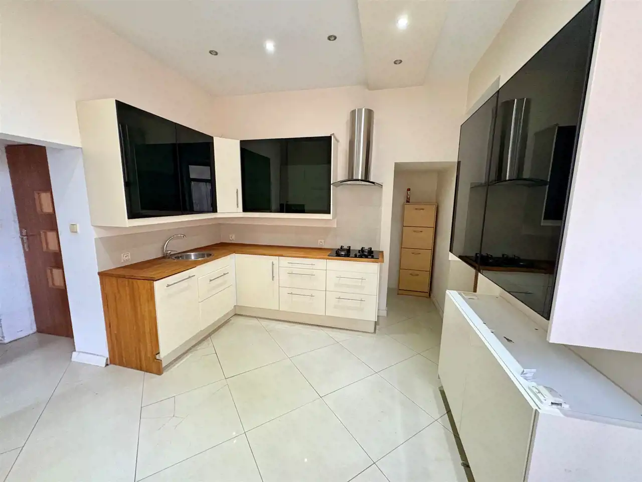 Wyremontowana kuchnia wykonana na wymiar wraz ze sprzętami AGD w zabudowie.