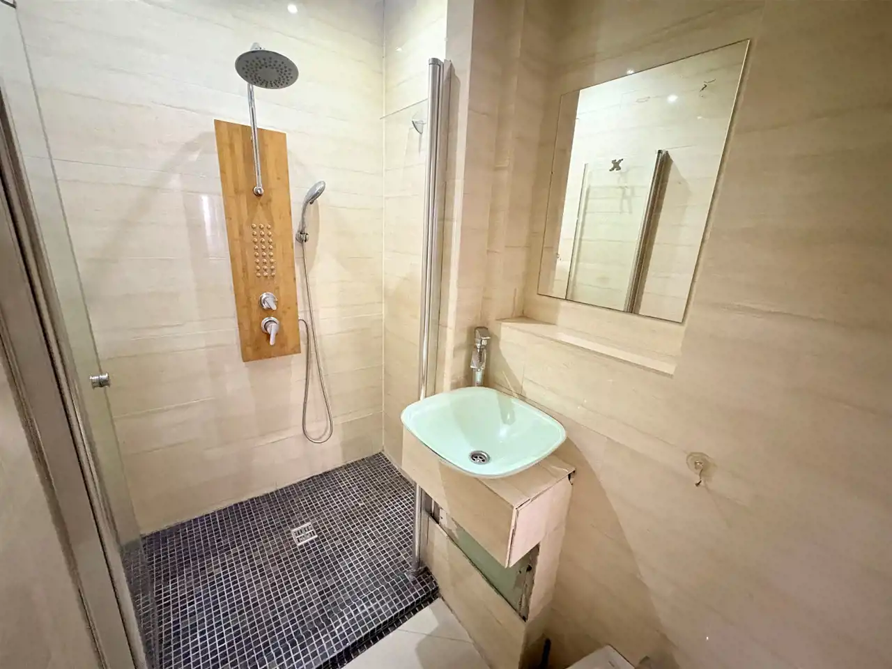 Łazienka z natryskiem. Okna PCV z okleiną drewnopodobną oraz roletami.