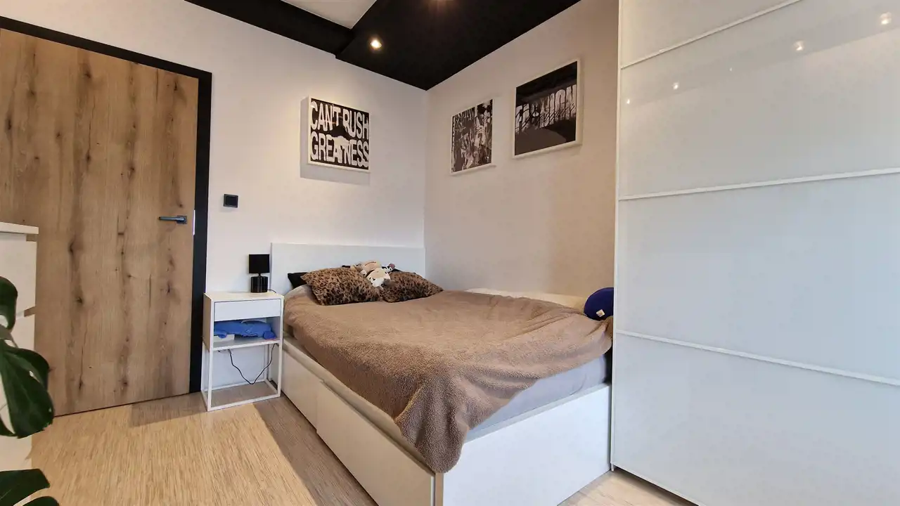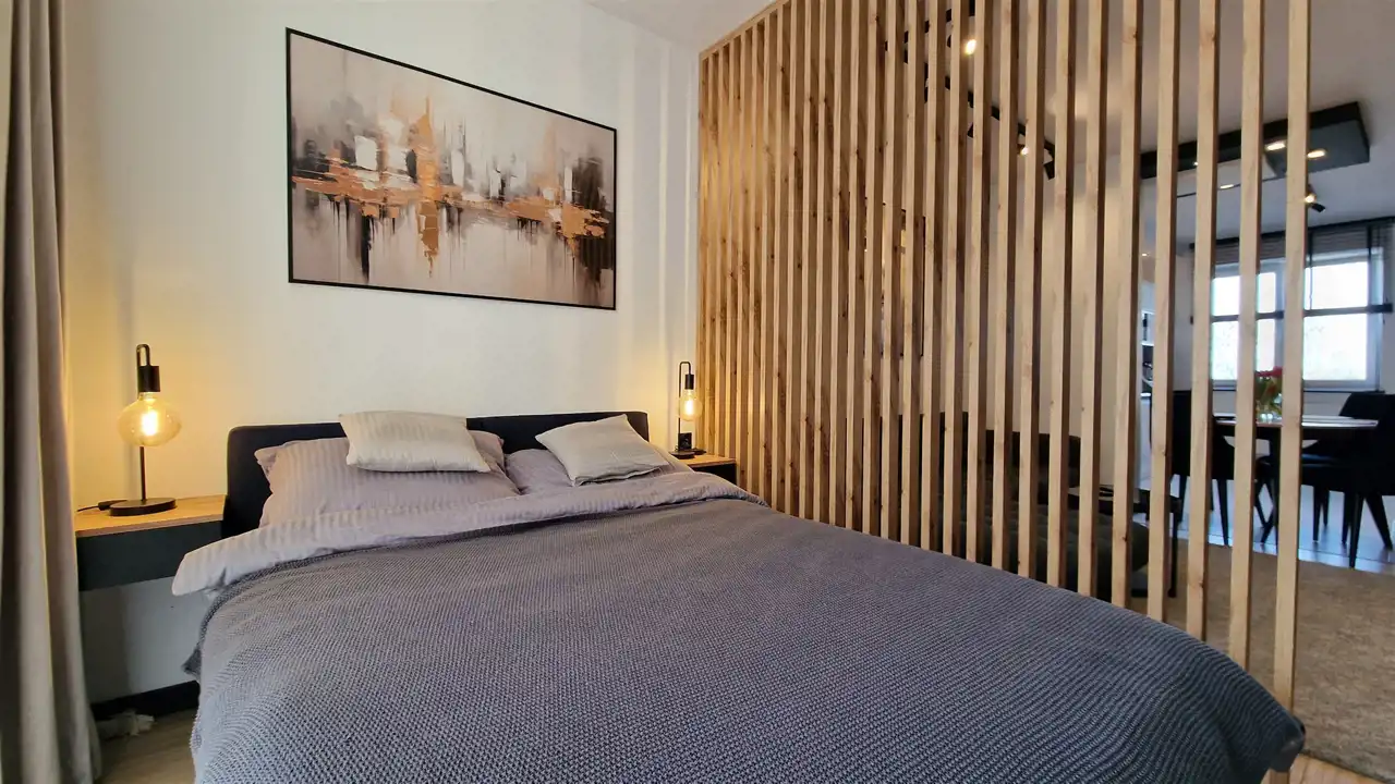 - jasny, przestronny salon z aneksem kuchennym, płynnie połączony z wydzieloną, intymną strefą sypialnianą,