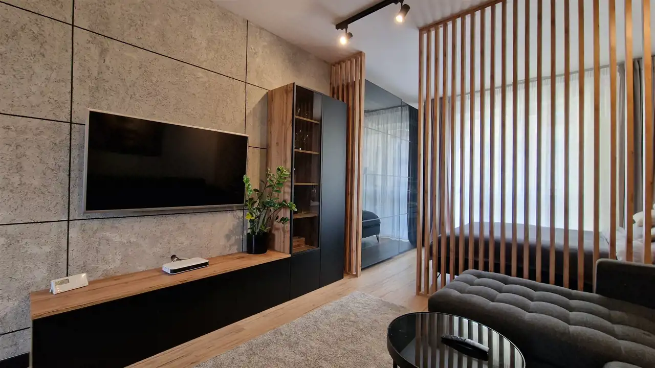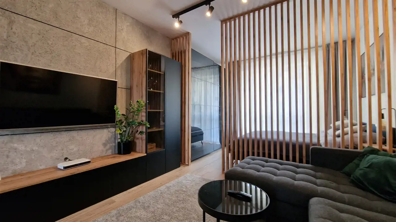 - jasny, przestronny salon z aneksem kuchennym, płynnie połączony z wydzieloną, intymną strefą sypialnianą,