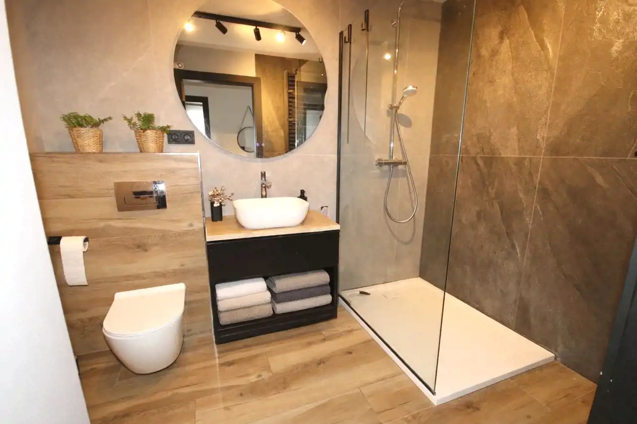 - łazienka z wc i prysznicem,