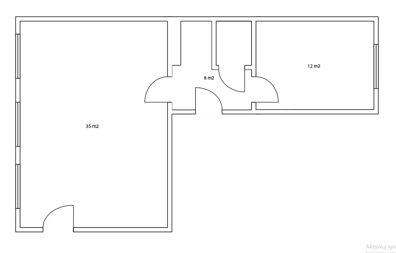 Rozkład: sala usługowo-sprzedażowa (35 m2), zaplecze (12 m2), hol z pomieszczeniem gospodarczym oraz łazienka z WC (8 m2).