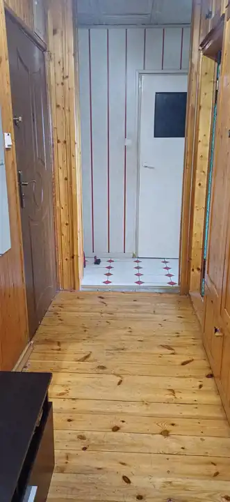 Rozkład : Przedpokój, z którego wchodzimy do dwóch niezależnych pokoi, jeden z nich z balkonem. Duża, przestronna kuchnia, która ma wyjście na balkon, jej kubatura daje wiele możliwości konstrukcyjnych. Bardzo duża łazienka z wanną, można w niej zmienić sposób wykorzystania pomieszczenia. Mieszkanie z dużym potencjałem.