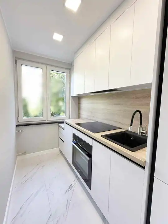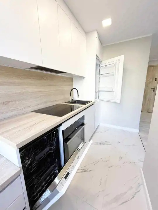 Wyposażenie: komfortowa kuchnia na wymiar- meble z blatem, lodówka w zabudowie, zmywarka w zabudowie, płyta z piekarnikiem