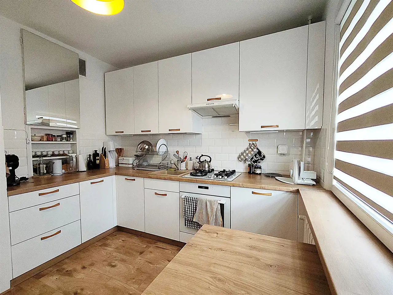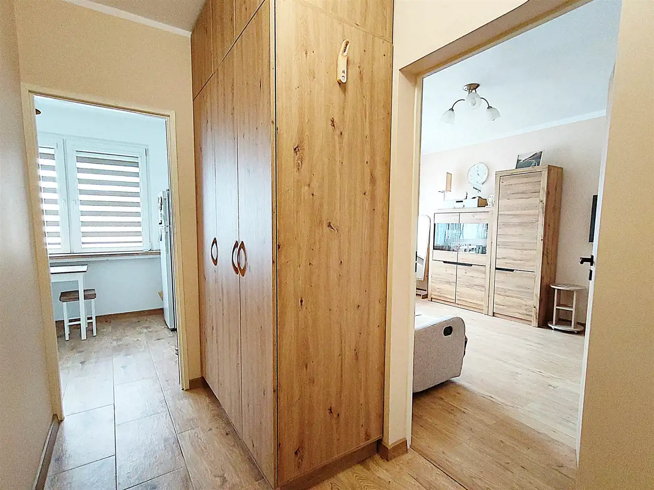Stan: Mieszkanie w bardzo dobrym stanie: okna PCV z roletami typu noc/dzień, w kuchni roleta zewnętrzna. Na podłogach kafle i panele. Mieszkanie jasne, ciepłe, słoneczne. Kuchnia jasna-duża. Ogrzewanie - CO miejskie. Cicha okolica, mieszkanie znajduje się na 3 piętrze.