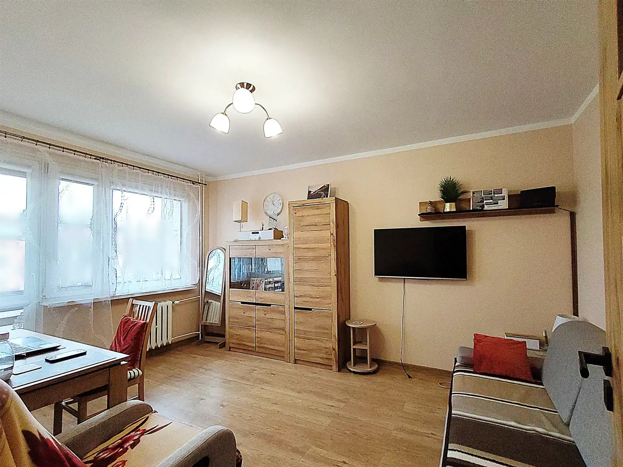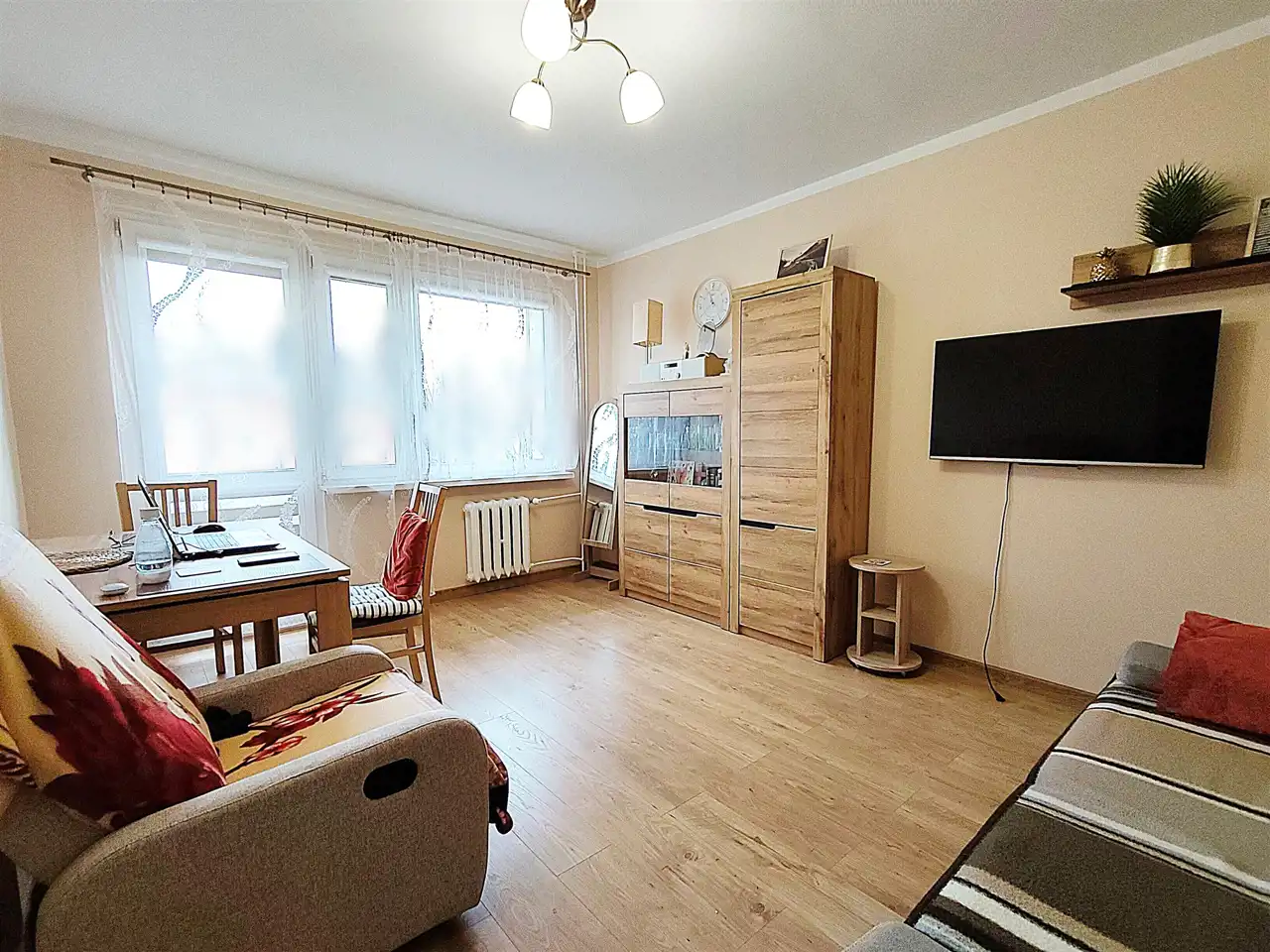 W cenie: meble kuchenne, sprzęt AGD i RTV, komplet wypoczynkowy, meble, stół z krzesłami, szafa na przedpokoju. Całe mieszkanie zostaje wyposażone. Właściciel zabiera tylko kilka detali.