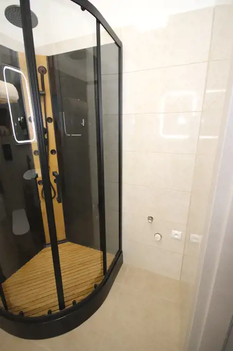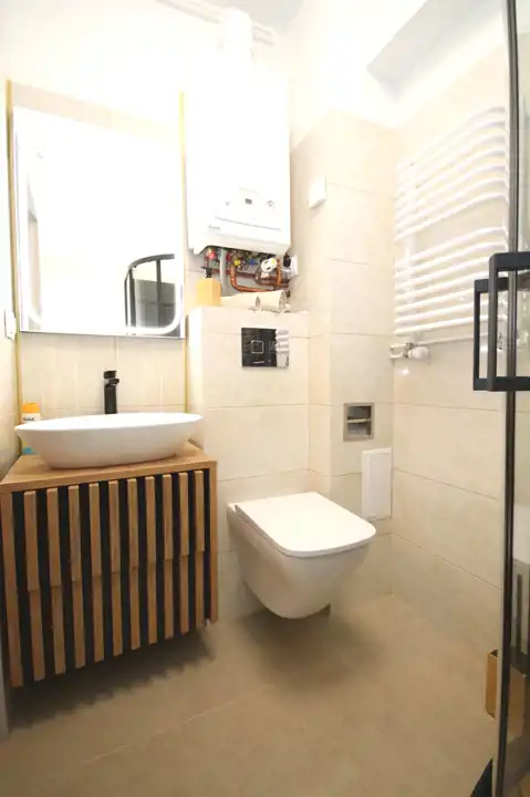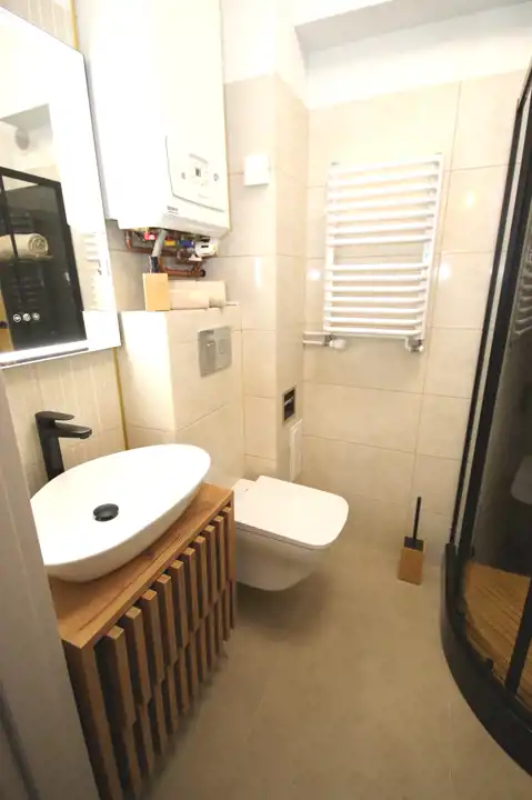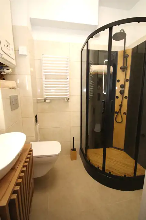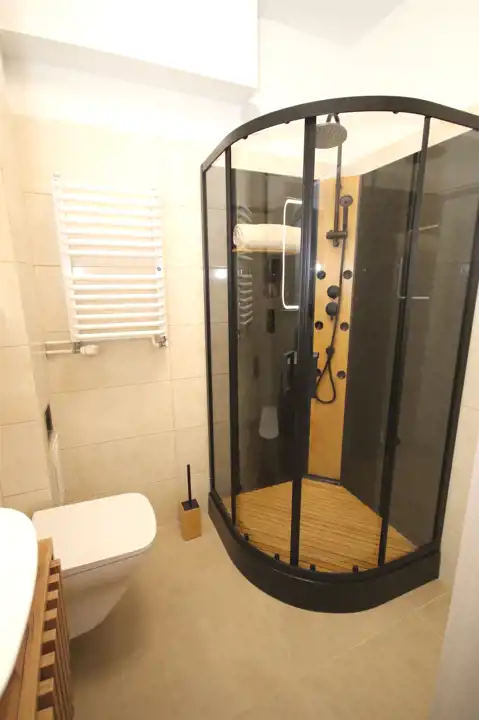 - W łazience miejsce na pralkę, nowa kabina prysznicowa, umywalka, podświetlane lustro, toaleta
