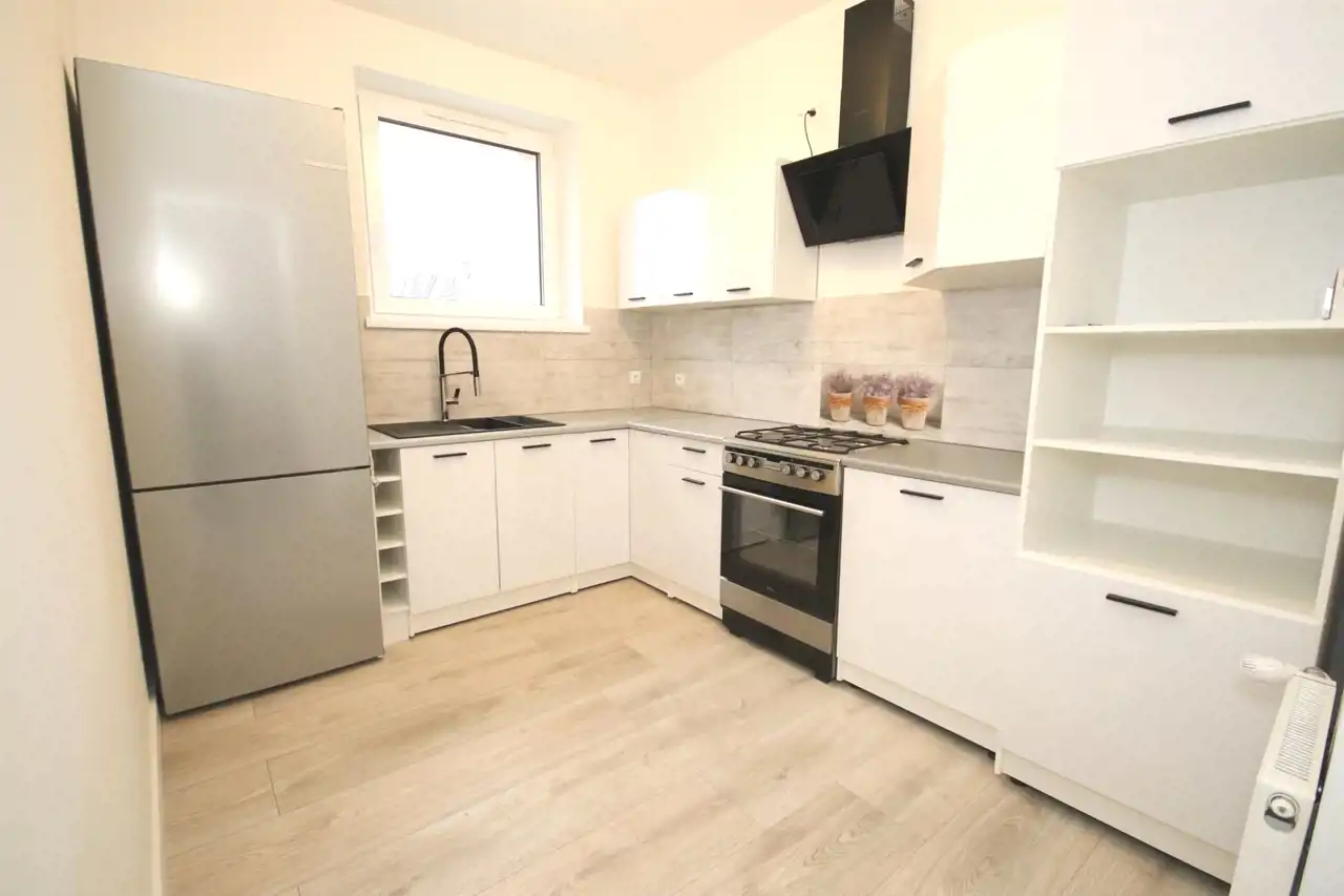 - Nowa stolarka drzwiowa i okienna; na podłogach panele i płytki; na ścianach gładzie