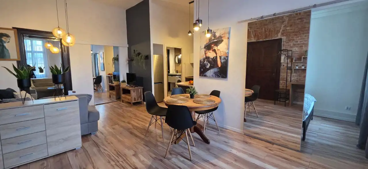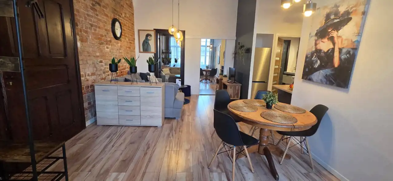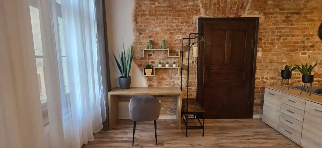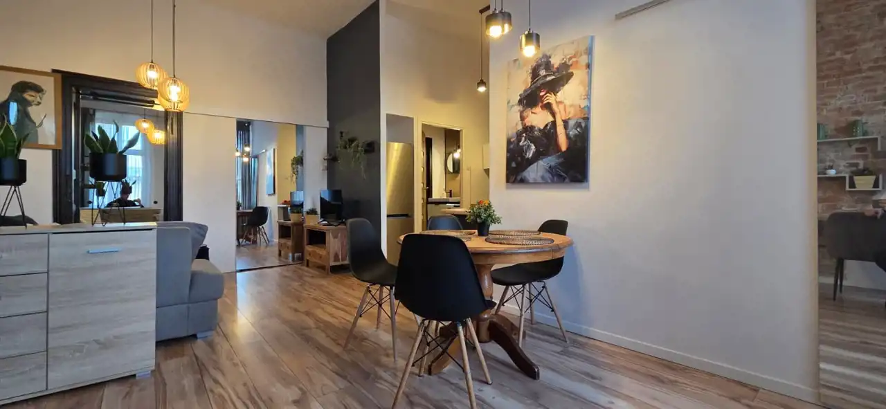 Wnętrze zachwyca odkrytą oryginalną cegłą, starannie dobranymi detalami oraz harmonijnym połączeniem różnych materiałów i faktur. Wysokie sufity i duże, drewniane okna zapewniają doskonałe doświetlenie oraz poczucie przestrzeni. Całość emanuje wyjątkowym klimatem – to mieszkanie z prawdziwą duszą.