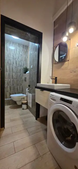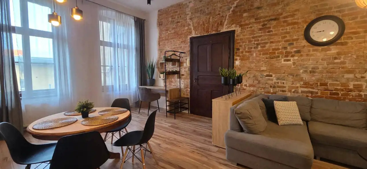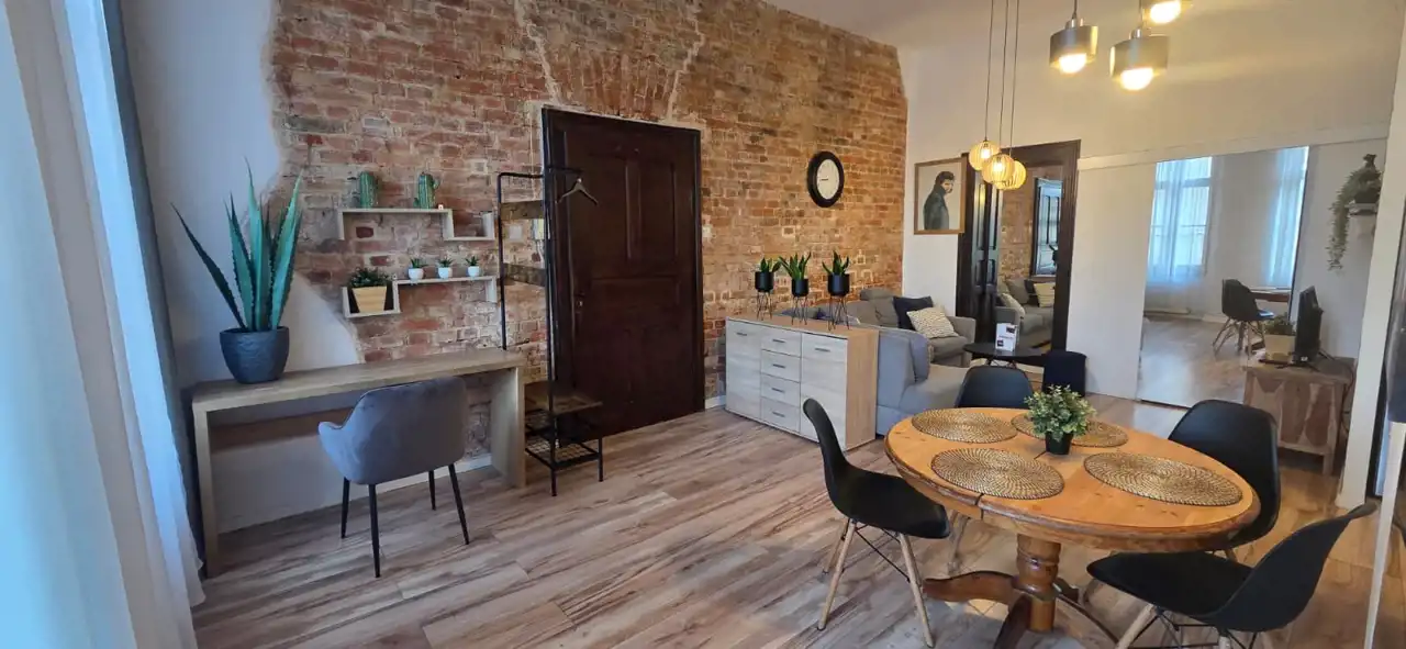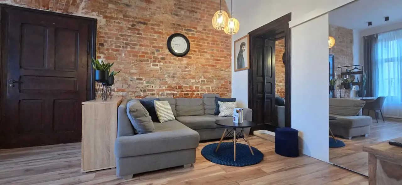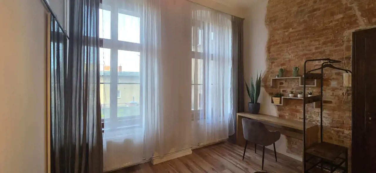 Wnętrze zachwyca odkrytą oryginalną cegłą, starannie dobranymi detalami oraz harmonijnym połączeniem różnych materiałów i faktur. Wysokie sufity i duże, drewniane okna zapewniają doskonałe doświetlenie oraz poczucie przestrzeni. Całość emanuje wyjątkowym klimatem – to mieszkanie z prawdziwą duszą.