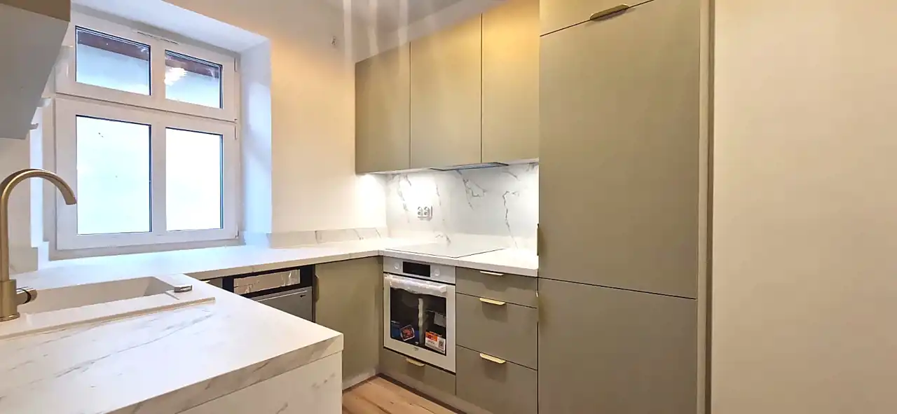 ✓ Kuchnia wykonana na wymiar + pełne wyposażenie AGD: zmywarka, płyta indukcyjna, piekarnik – wszystko nowe