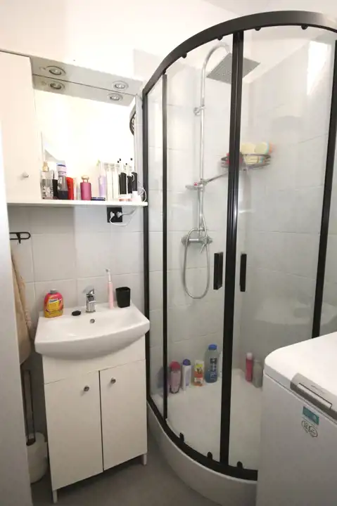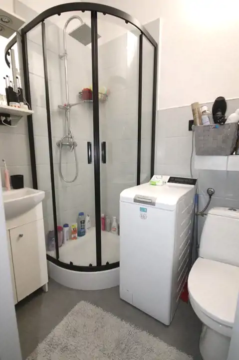 - Łazienka z kabiną prysznicową, umywalką, toaletą oraz pralką,