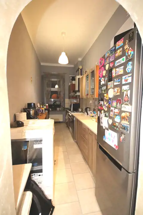 - Na podłogach panele i płytki; okna PCV, wymieniona stolarka drzwiowa i okienna; na ścianach tynki strukturalne, tapety, glazura (łazienka, kuchnia),