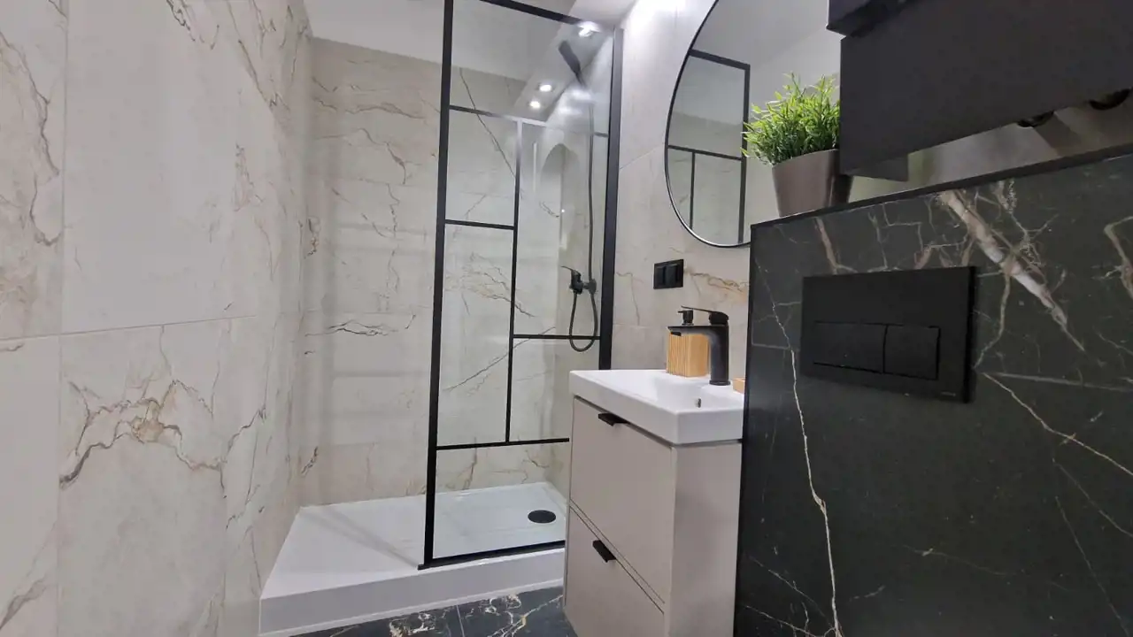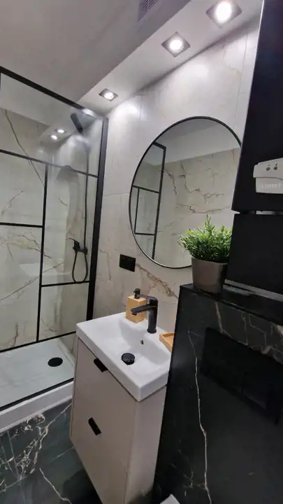 Łazienka została wykończona nową armaturą i płytkami, z przygotowanym miejscem na pralkę.