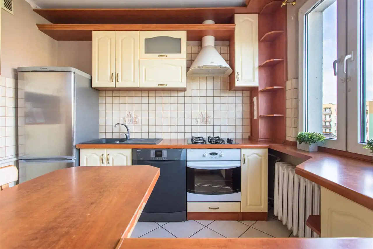 Gaz doprowadzony do mieszkania – kuchnia wyposażona w sprawną kuchenkę gazową, co daje swobodę wyboru preferowanego sposobu gotowania.