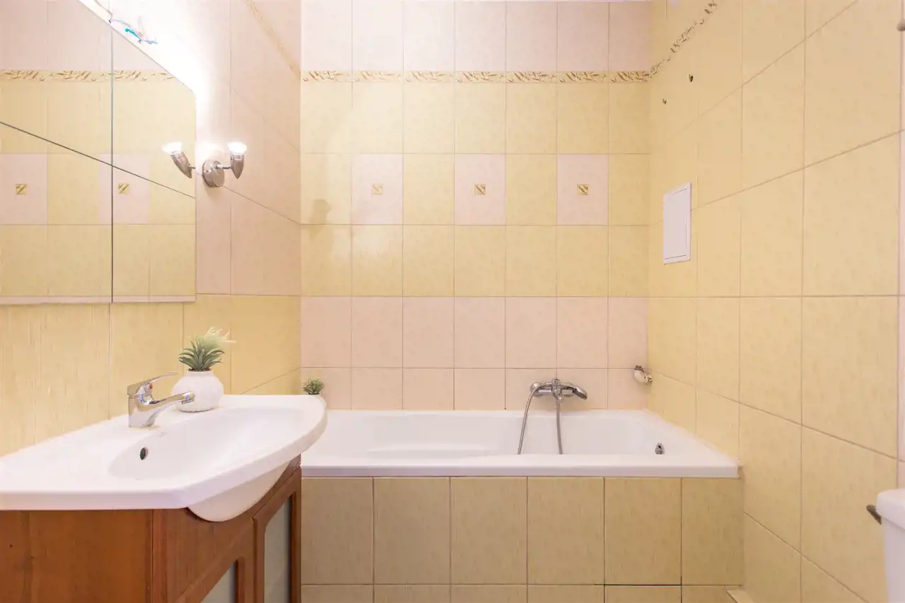 Łazienka z WC wyposażona w wannę to miejsce, gdzie można się zrelaksować po długim dniu – ciepła kąpiel, świece i cisza to przepis na domowe SPA.