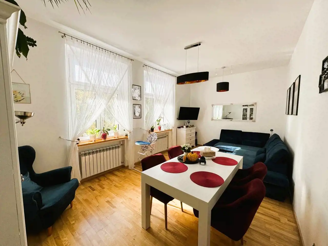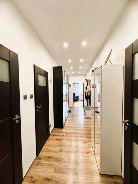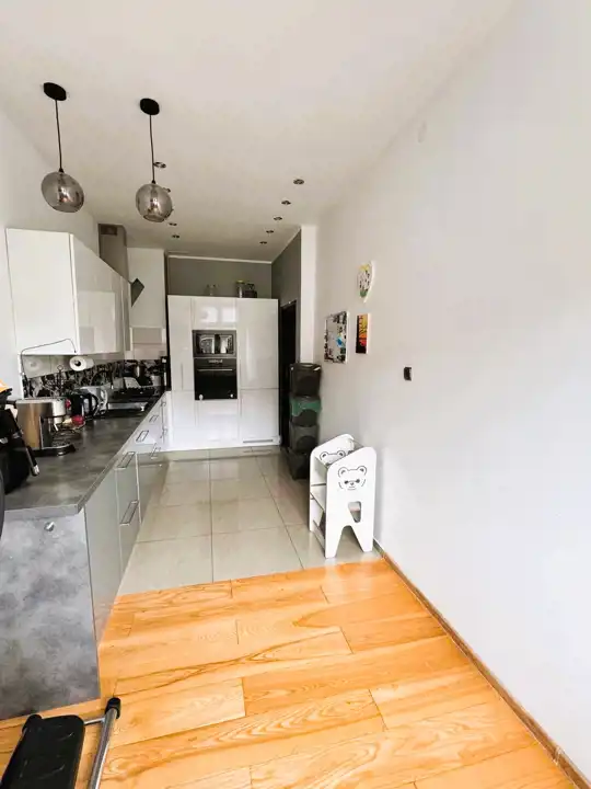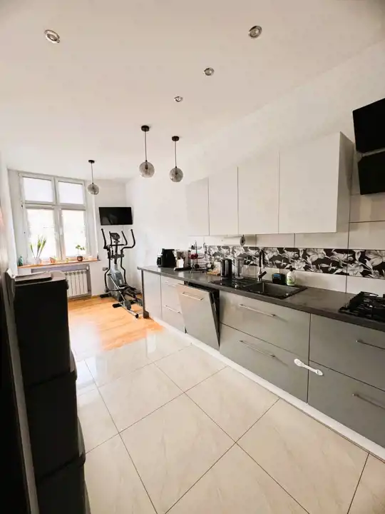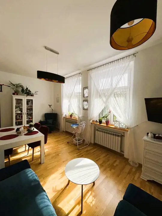 W pokojach zachowane drewniane deski podłogowe, które nadają wnętrzom ciepły i elegancki charakter. Łazienka wyposażona w przestronną kabinę prysznicową z niskim brodzikiem. Ogrzewanie oraz ciepła woda z pieca gazowego dwufunkcyjnego. Okna PCV.