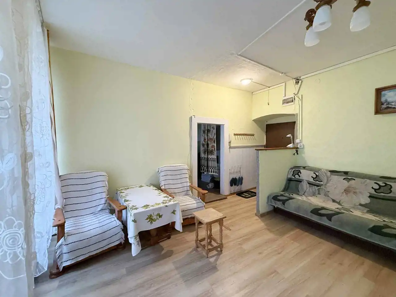 Rozkład: przedpokój, 2 duże pokoje, oddzielna kuchnia wraz z prowizoryczną łazienką- wanną przedzielona od reszty kuchni kotarą, WC na klatce schodowej.