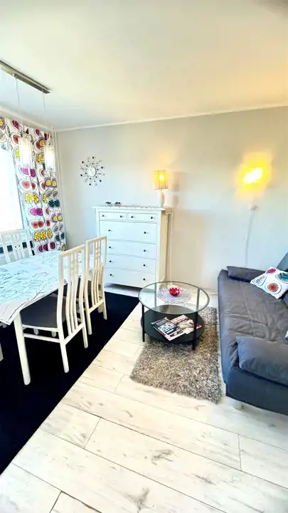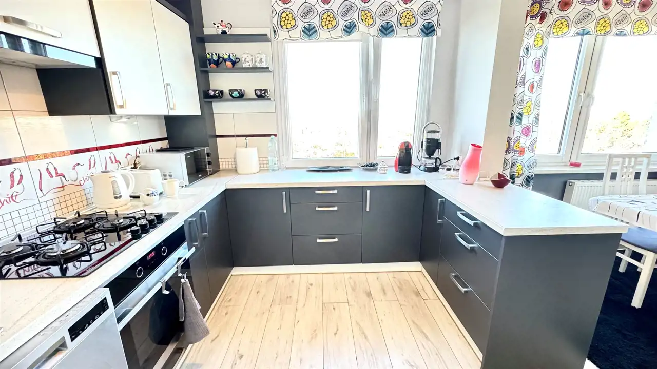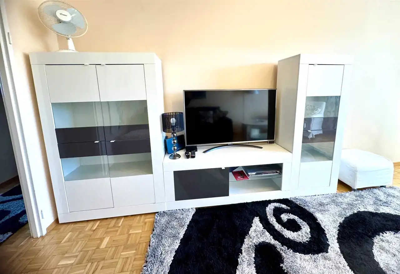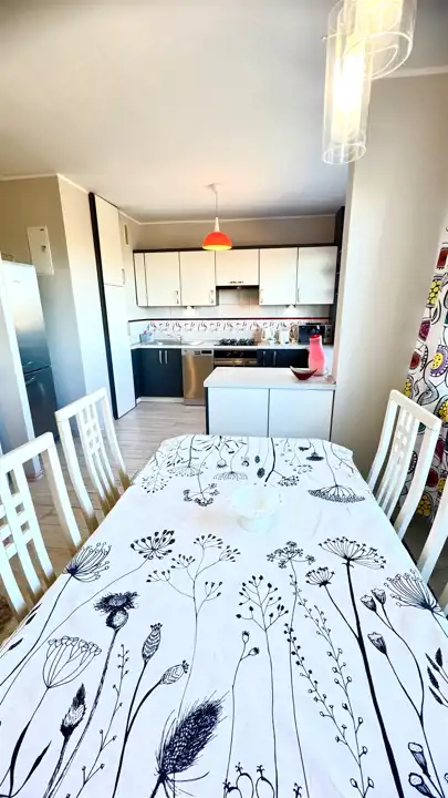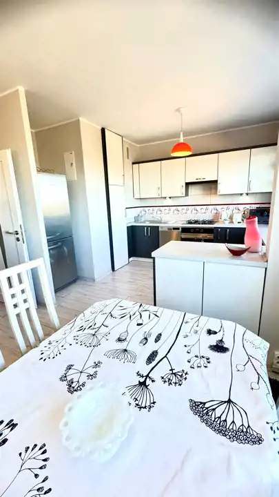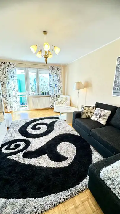 Mieszkanie w pełni umeblowane i wyposażone w niezbędne sprzęty AGD (zmywarka, lodówko-zamrażalka, pralka) oraz TV.