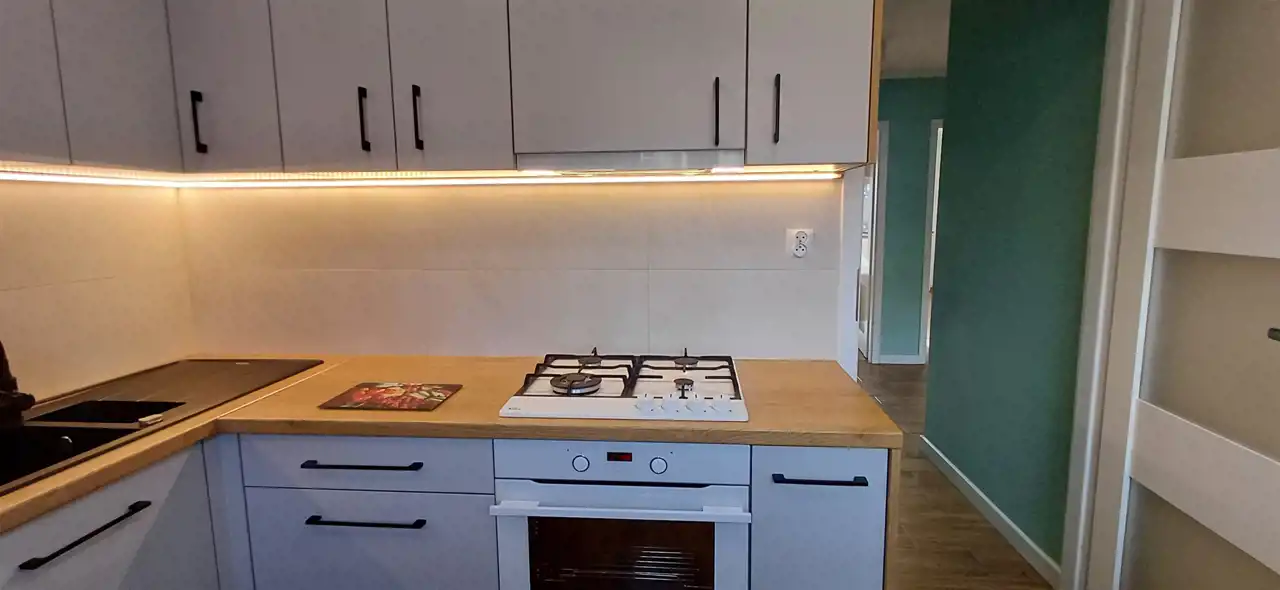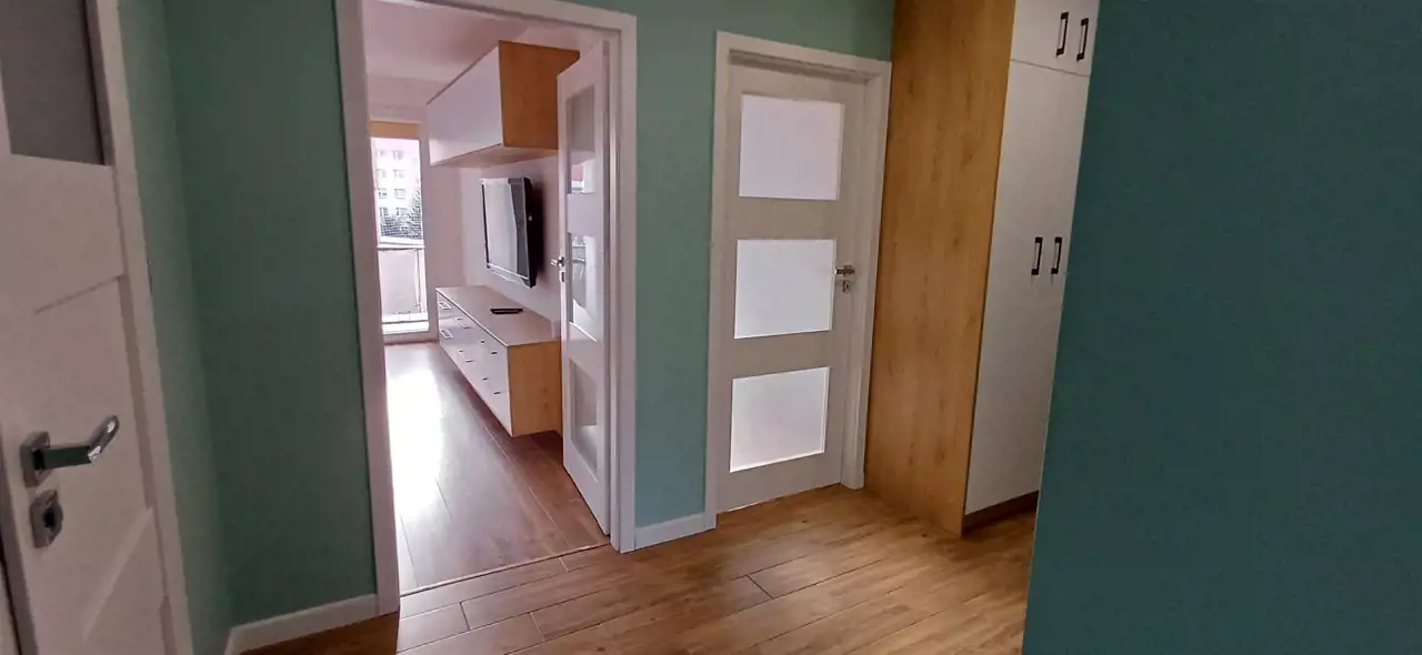 Rozkład :Duży, otwarty przedpokój, z którego wchodzi się do trzech niezależnych, pokoi, dwa z nich to sypialnie, jedna w pełnej zabudowie. Duży salon z balkonem. Nowoczesna łazienka z dużą wanną, osobno WC. W pełni umeblowana i wyposażona kuchnia.