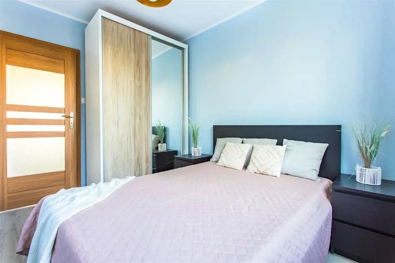 Sypialnia główna z dużym, wygodnym łóżkiem i pojemną szafą przesuwną – miejsce, gdzie wieczory kończą się spokojem, a poranki zaczynają się od promieni słońca wpadających przez okno.