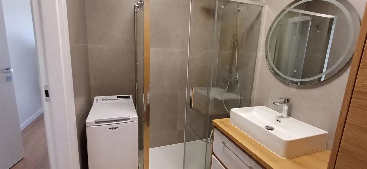 Rozkład : Duży, otwarty przedpokój, z którego wchodzi się do dwóch niezależnych, w pełni umeblowanych sypialni. Nowoczesna łazienka z kabiną prysznicową i WC, przestronny pokój dzienny, salon z dużym tarasem i kuchnią w pełnej zabudowie.