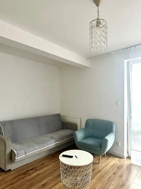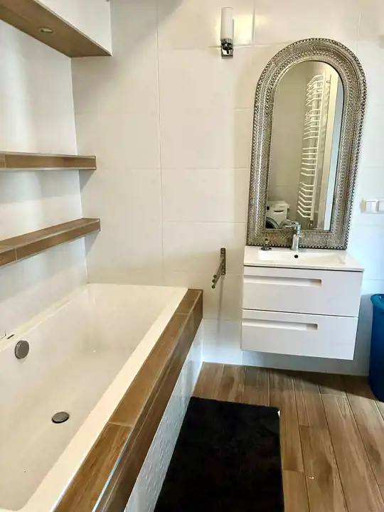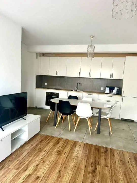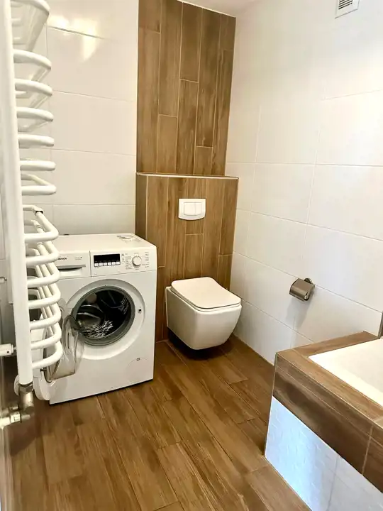Apartament wyposażony w podstawowe meble: kuchnia w zabudowie wraz ze zmywarką, piekarnikiem, płytą indukcyjną, lodówko-zamrażalką. W łazience wanna, sedes, umywalka, pralka. Pozostałe meble widoczne na zdjęciach.