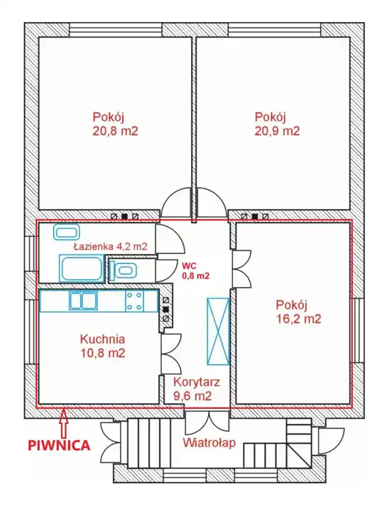 - trzy pokoje, w tym dwa o powierzchni ok 21m2 /możliwość podziału na 2 mniejsze