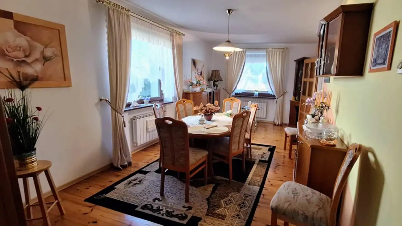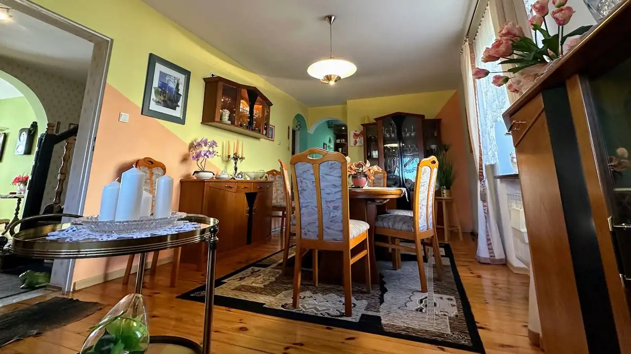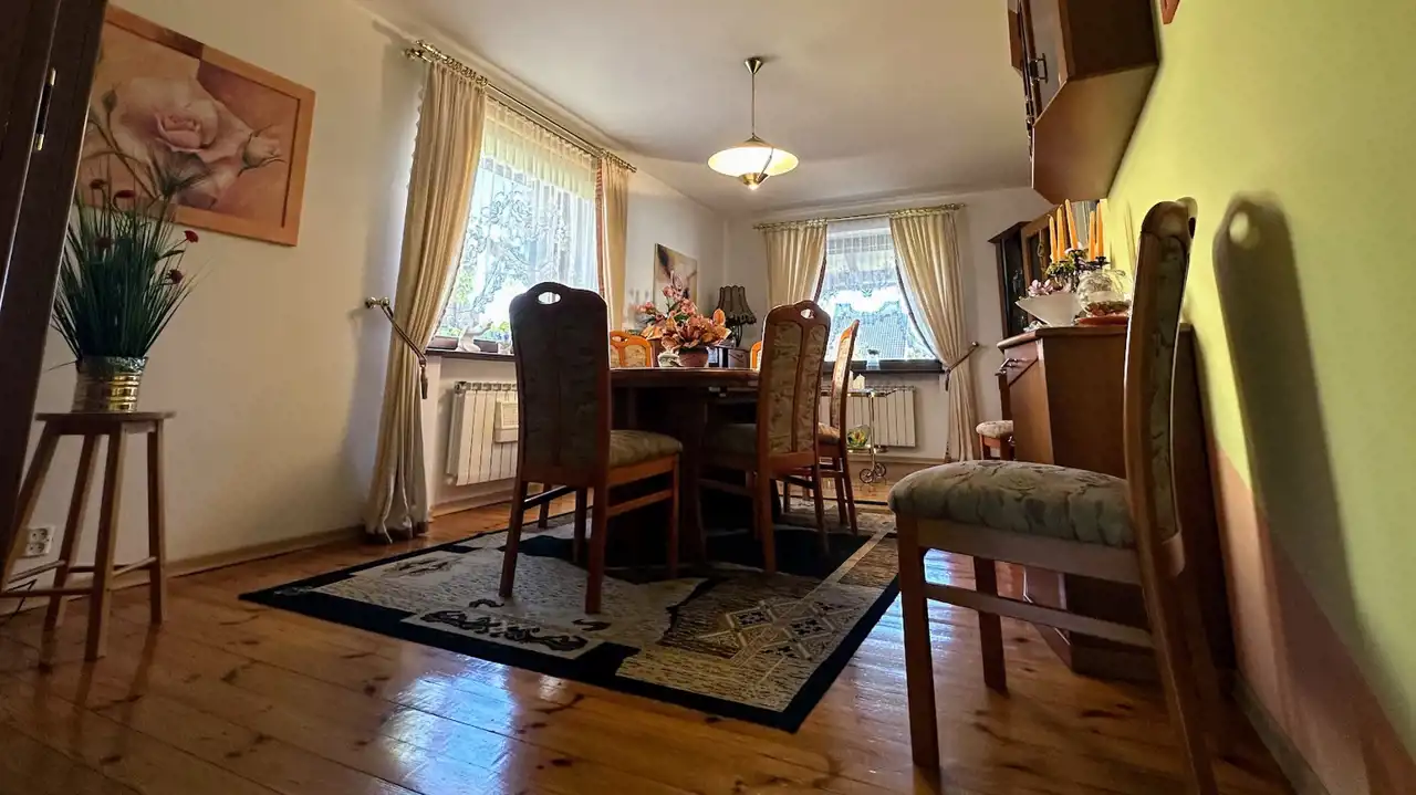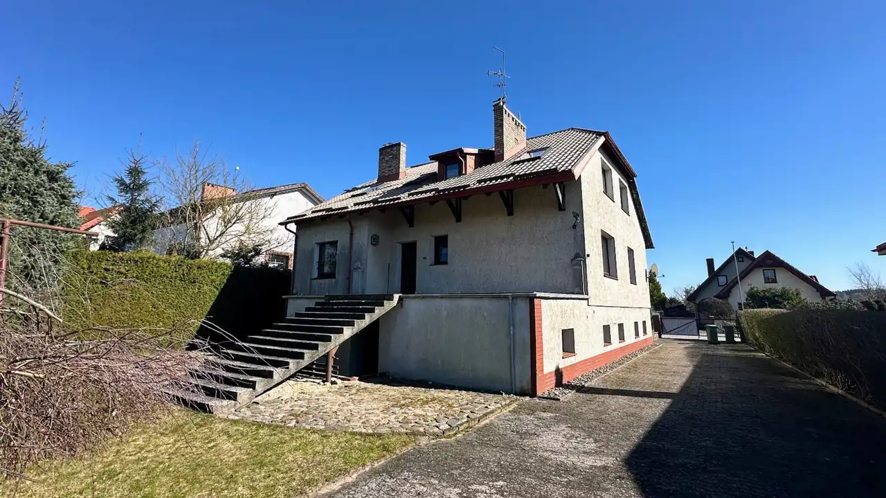 Dom wolnostojący o powierzchni 270m2. Przyziemie - 2 oddzielne mieszkania z kuchniami, łazienkami oraz niezależnym ogrzewaniem. Pralnia, kotłownia, garaż. Parter - salon, jadalnia, pokój, kuchnia, spiżarnia , łazienka. Piętro - 3 pokoje, sypialnia, łazienka, garderoba. Dwa tarasy od frontu oraz tyłu budynku. Ogrzewanie oraz ciepła woda z pieca gazowego lub na pellet i drewno. Działka 1677m2 z drzewami owocowymi , krzewami ozdobnymi , kwiatami oraz garażem blaszanym.