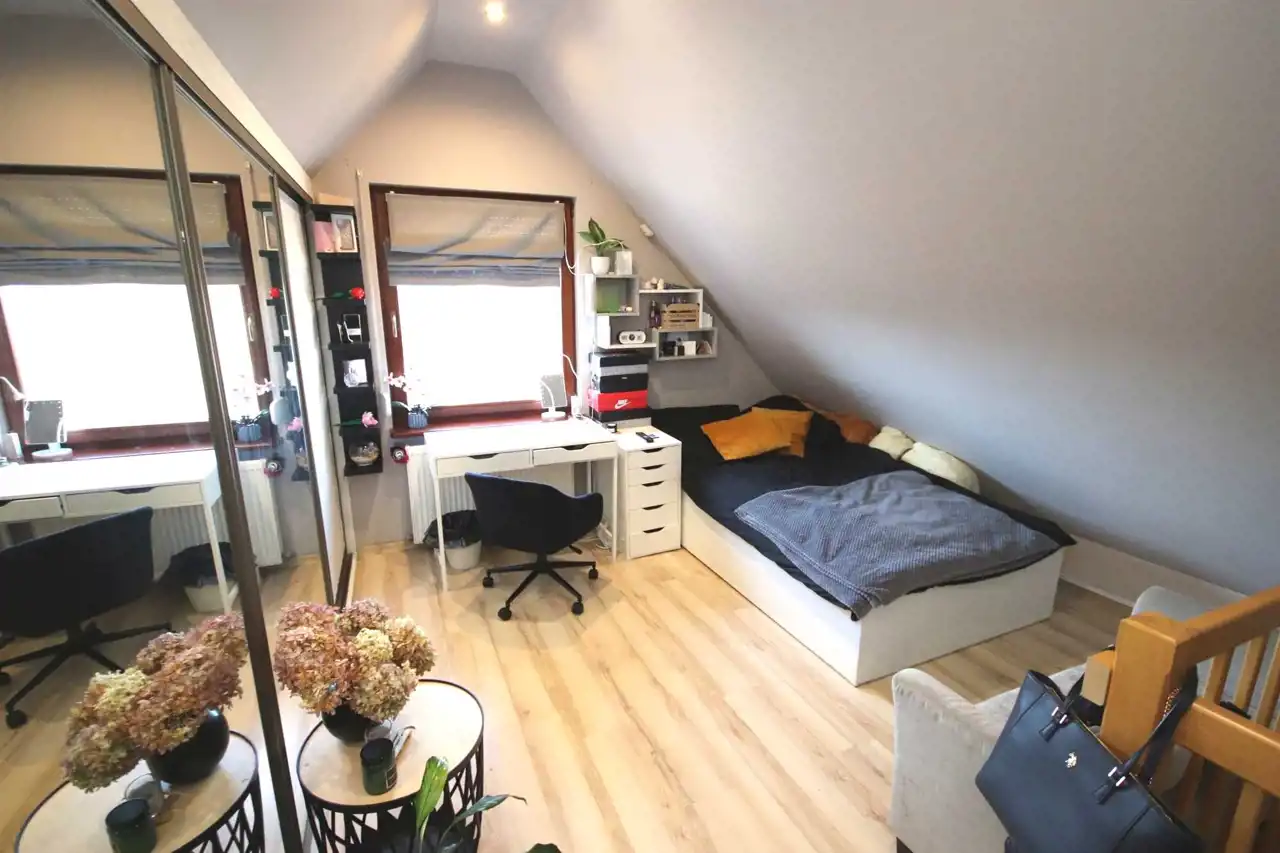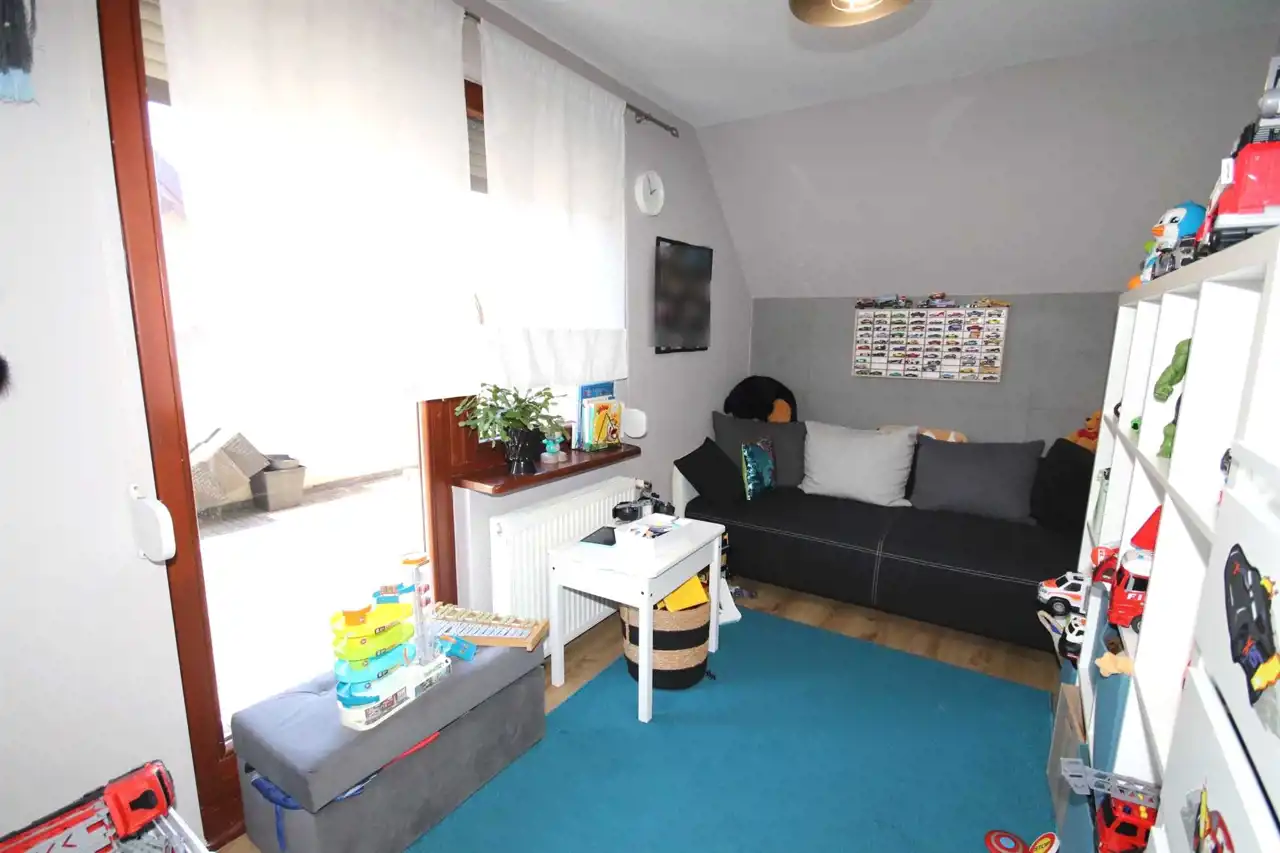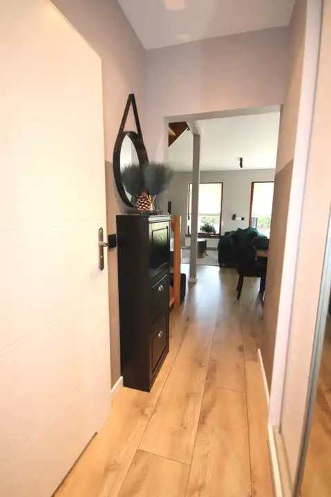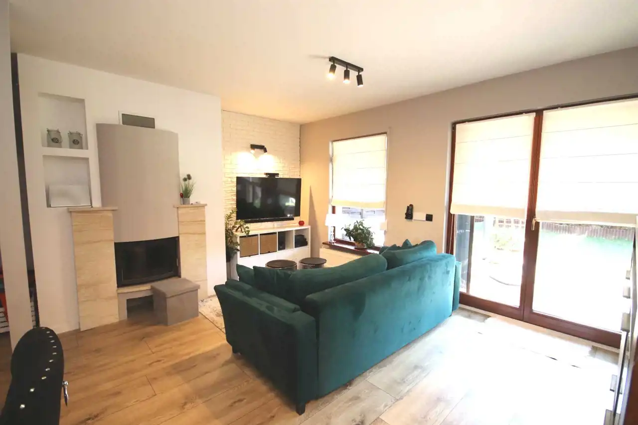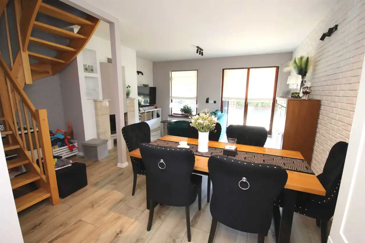 **W salonie kominek z płaszczem wodnym, w kuchni zabudowa kuchenna, w przedpokoju pojemna szafa w zabudowie, a w sypialni na poddaszu zagospodarowana garderoba.