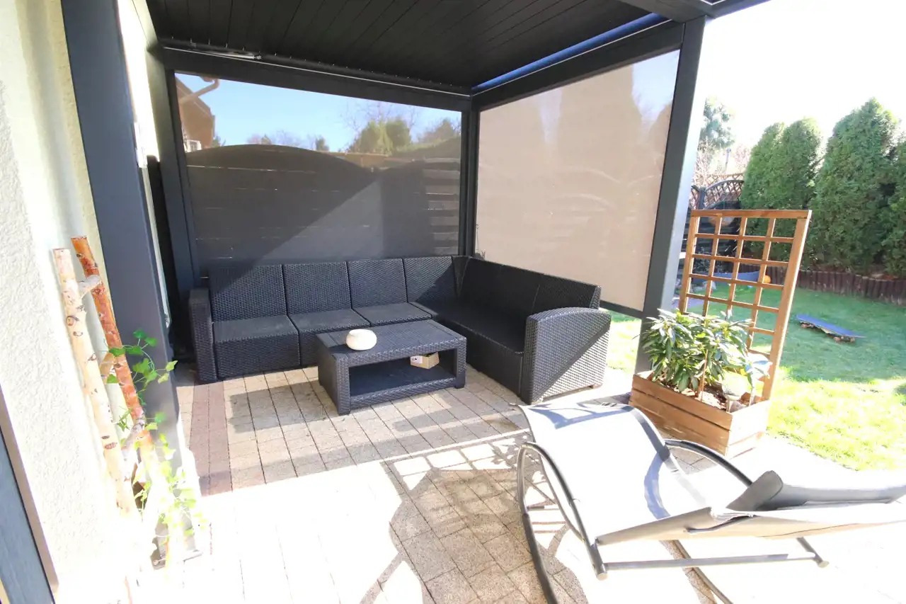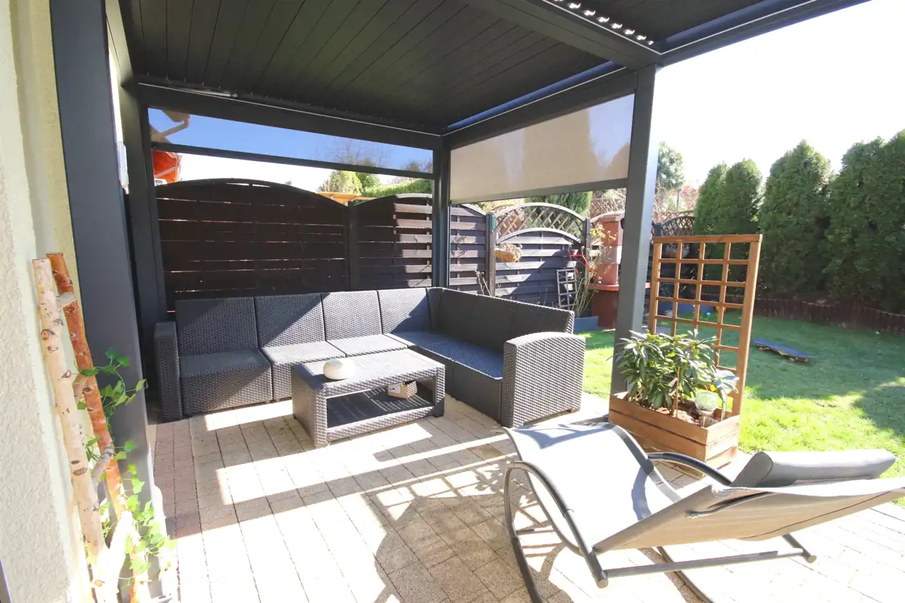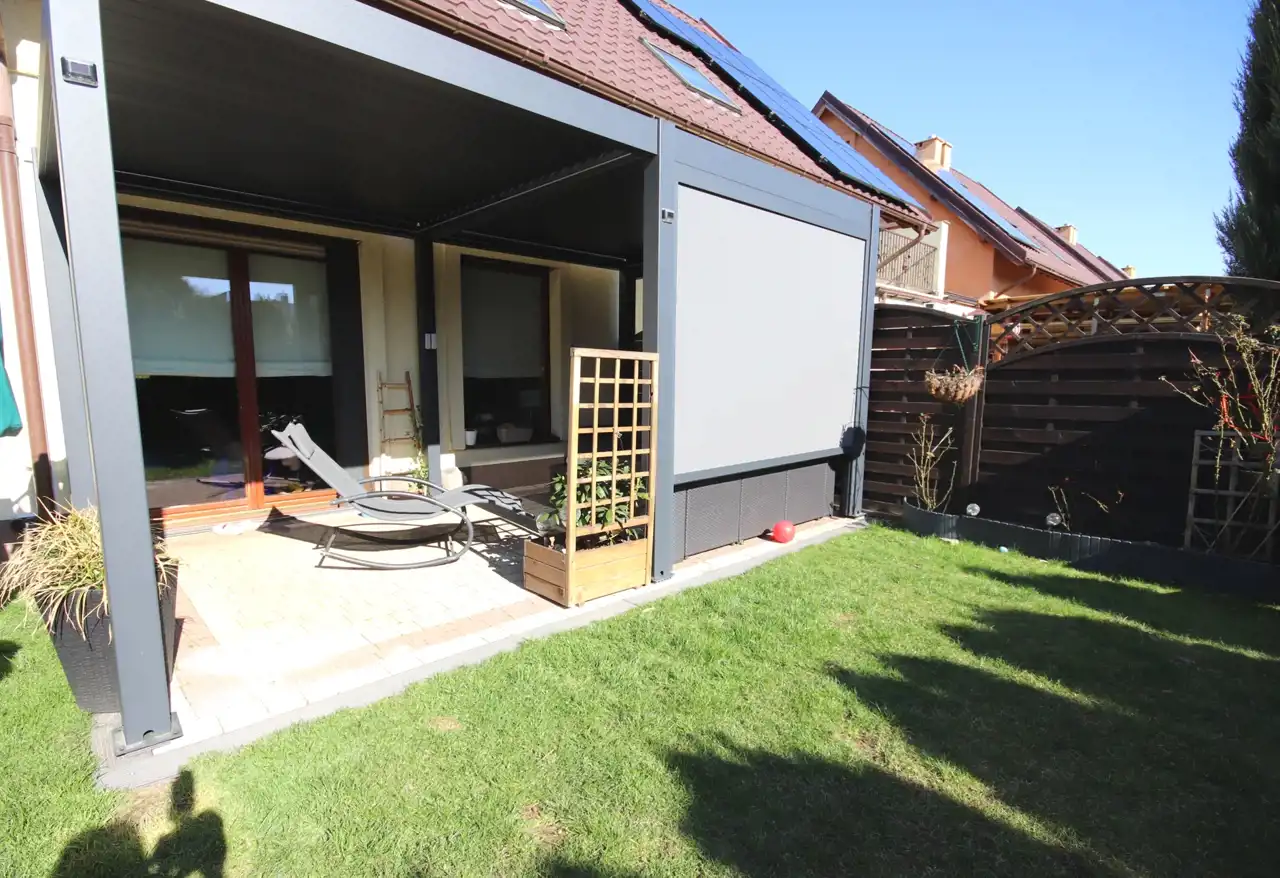 **Dużym atutem przy tak nasłonecznionej działce, jest nowocześnie zadaszony taras- sterowany automatycznie (z dachem aluminiowym, składającym się z obracanych paneli, tzw. lamel).