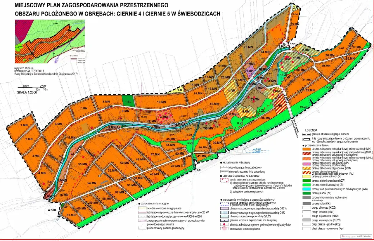 - Działka objęta Miejscowym Planem Zagospodarowania Przestrzennego- zabudowa mieszkaniowa jednorodzinna (13. MN), droga wewnętrzna (7. KDW) i droga lokalna (1.KDL)