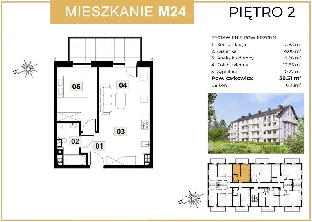 - Charakterystyka mieszkania 38.31 m2, 2 pokoje