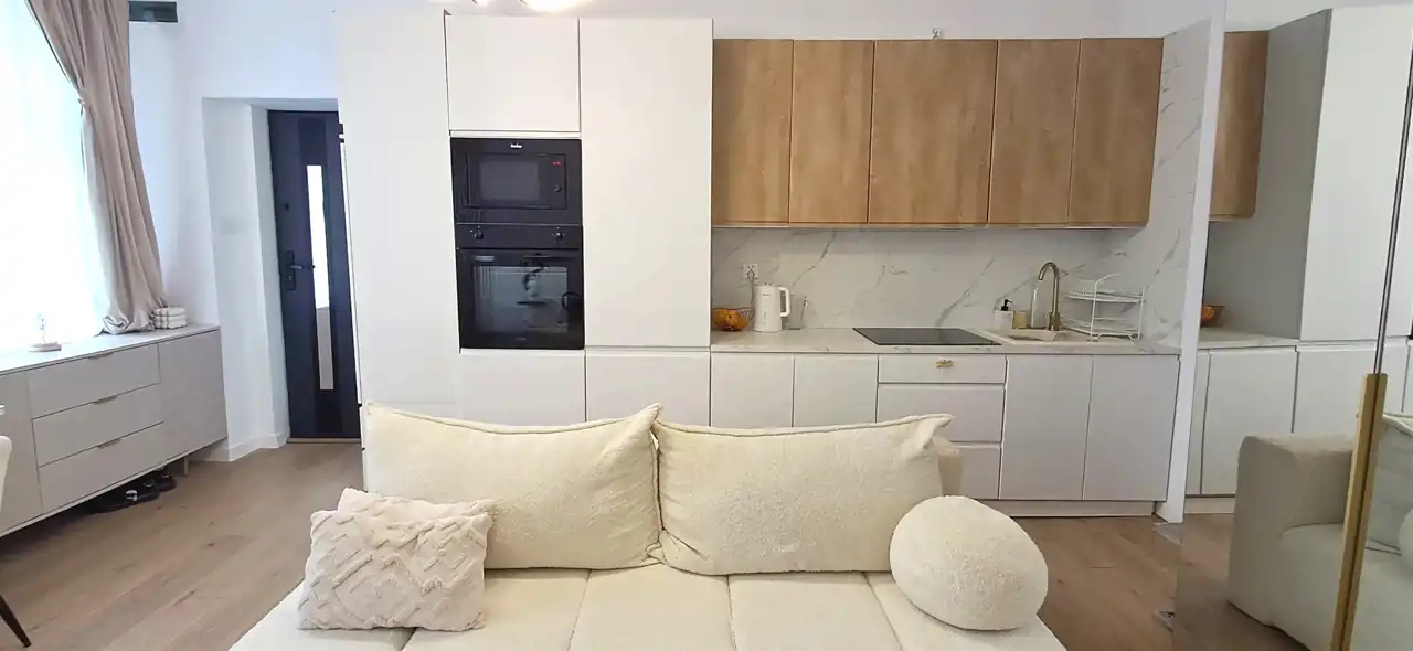 jasny, przestronny salon z aneksem kuchennym z zabudową meblową i sprzętem AGD,