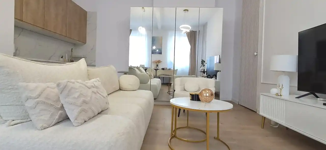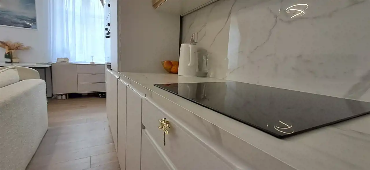 jasny, przestronny salon z aneksem kuchennym z zabudową meblową i sprzętem AGD,